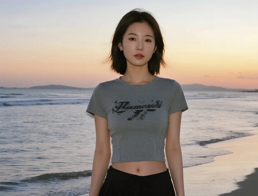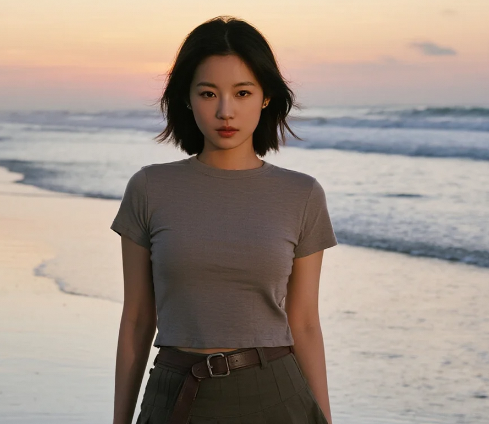 她站在海边回眸一笑,仿佛晚霞都为她停留