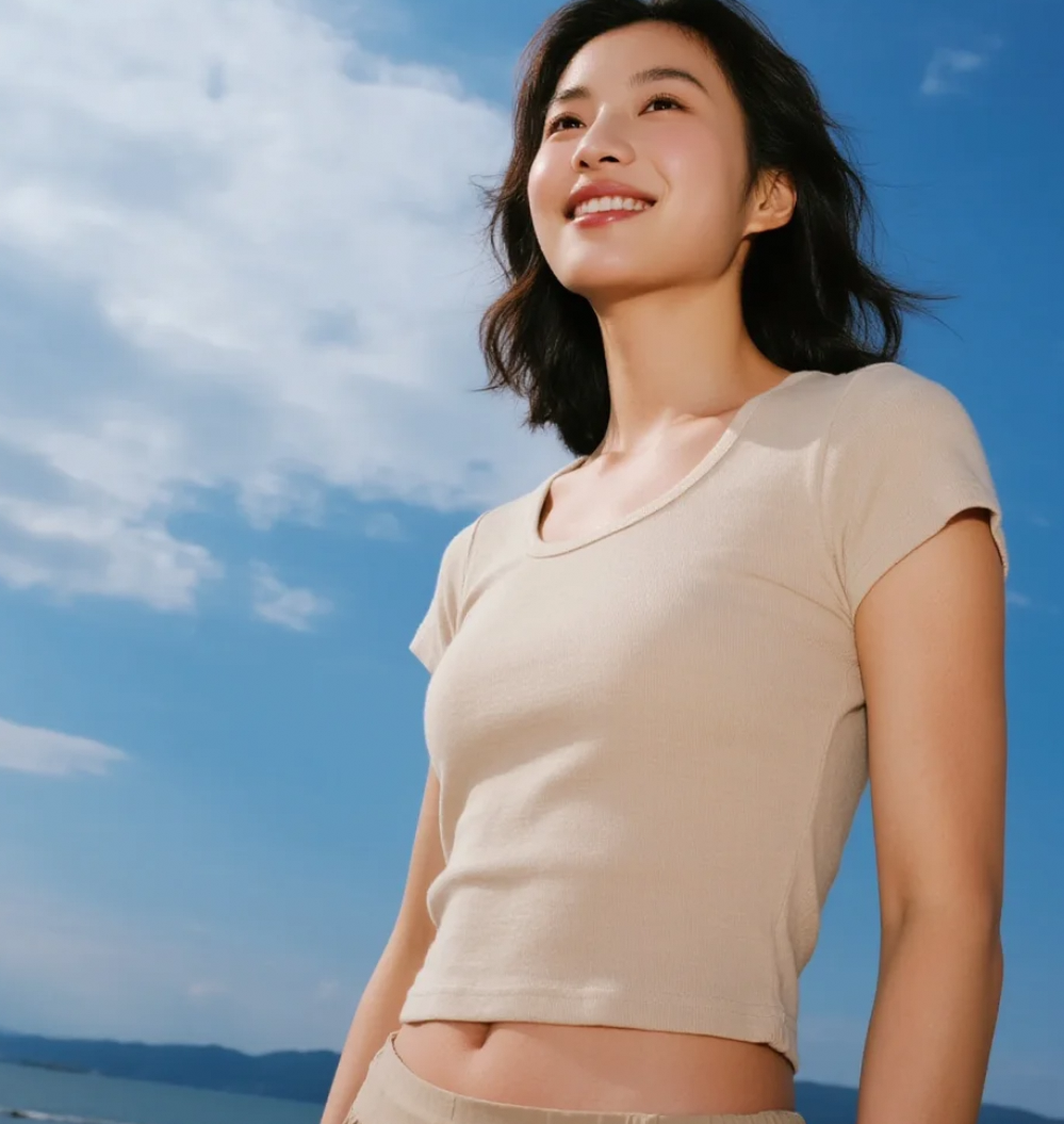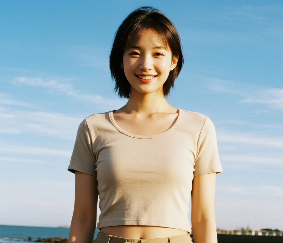 海风轻拂,她的微笑与蓝天白云构成了最和谐的画面