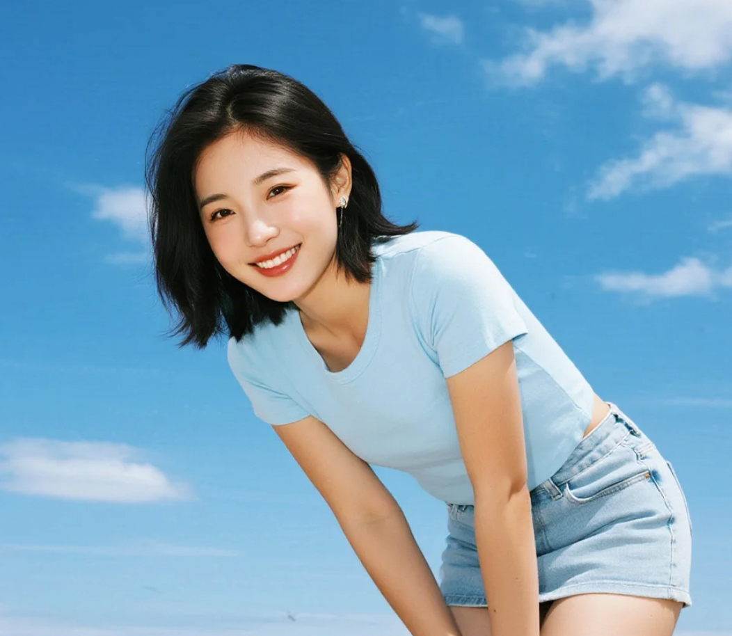 天空湛蓝,她的微笑如海浪般温柔涌来