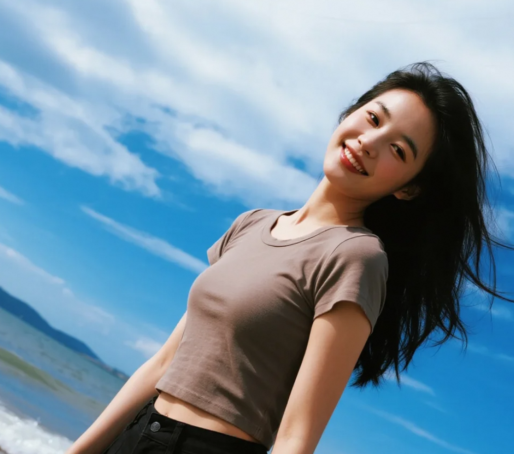 湛蓝天空下,她的微笑是海风中最温柔的旋律