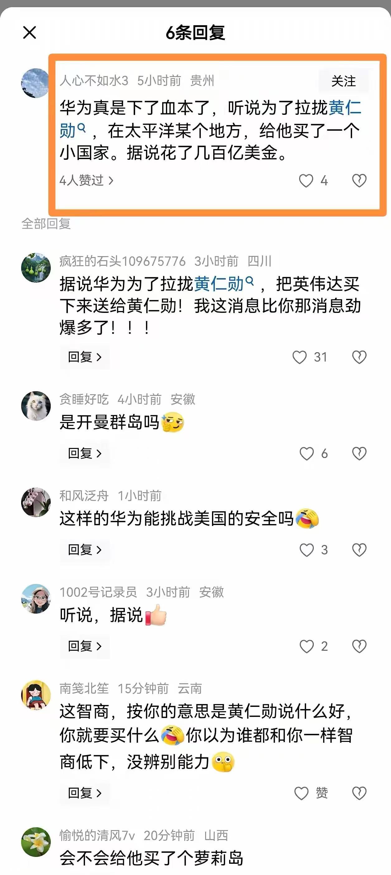 英伟达黄仁勋因为盛赞华为的手机世界上最好,华为AI芯片将取代英伟达,让很多中国人傻眼了。 有网友说华为为了收买黄仁勋,花几百亿美金给他买了个小国家。 也有网友说,英伟达就是华为买下来送给黄仁勋的。 这里面有人可能是反讽,但也有人可能是真的想贬低华为。 有一点可以肯定,就是中国的科技企业崛起,一定会让很多美粉非常的痛苦。