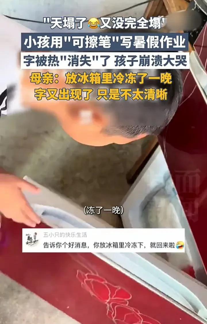 别再给孩子乱买笔了!7月19日,江苏镇江一名女子发视频称,自己之前给孩子买了“可擦笔”,孩子用它写完暑假作业后,由于天气太热,导致写的字都“消失”了,之后孩子哭了很久,有网友建议放在冰箱里,冷冻后字回来了,但是不太清晰。