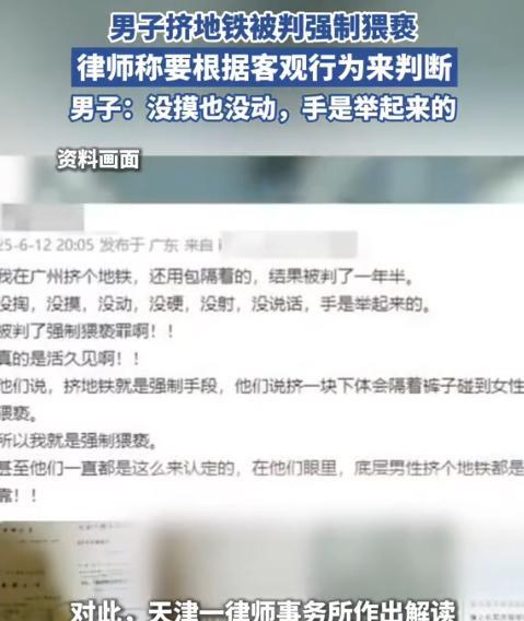 广州,男子称挤地铁时,身体隔着包碰触到女性身体,没有摸、没动,连手也是举起来的,结果对方不愿意了报警,自己被以强制猥亵罪判处有期徒刑1年个月。 据汉风号7月16日报道,男子挤地铁被判强制猥 亵,男子表示没摸也没动,手是举起的。 正赶上广州地铁晚高峰,男子像往常一样上班回家,车厢里人挤人。 他双手举着,抓住扶手,为的就是尽量避免和别人有身体接触。 他背着个帆布包,包里装了些随身物品,包括一个圆形耳机盒。可就在他站着发呆的时候,身后突然一名女生质问他:“你是不是在故意顶我?”说他用身体去蹭人。 男子当场就懵了,赶紧解释说自己完全是被人群推着走,根本没那意思。但女生不信,当场报警。 本来以为只是误会,很快就能说清楚,结果进入司法程序后,事情完全变了味。 一审法院判他“强制猥亵罪”成立,坐牢一年半。 判决理由是:他趁地铁拥挤,用下体贴靠被害人臀部。 可男子自己一口咬定没有动手,裤子上也没有发现任何“可疑痕迹”,监控也没拍到什么不当行为,甚至连法律援助律师都觉得他无罪。 到了二审,男子坚持上诉,不愿“认罪止损”。 可惜二审法院还是维持原判,理由是:哪怕没有生物痕迹,也不能证明就没有猥亵行为。 男子正在申请再审,希望能“洗清冤屈”。 这事在网上曝光后,舆论一下子炸开了锅。 有人站在女生一边,说女性在公共场合必须被保护,哪怕只是“可能”有不轨行为,也不能轻易放过。 而另一边的人则质疑,光凭一面之词就定罪,太武断了。 毕竟广州地铁有多挤大家都知道,肩碰肩、包贴包根本避免不了,难不成以后男的都得背双手出门? “强制猥亵”罪关键在于有没有故意。但问题是,怎么判断一个人有没有“那个意思”?地铁那么多人,稍微一晃就可能贴到别人,谁说得清到底是无意的,还是故意的? 信源:汉风号
