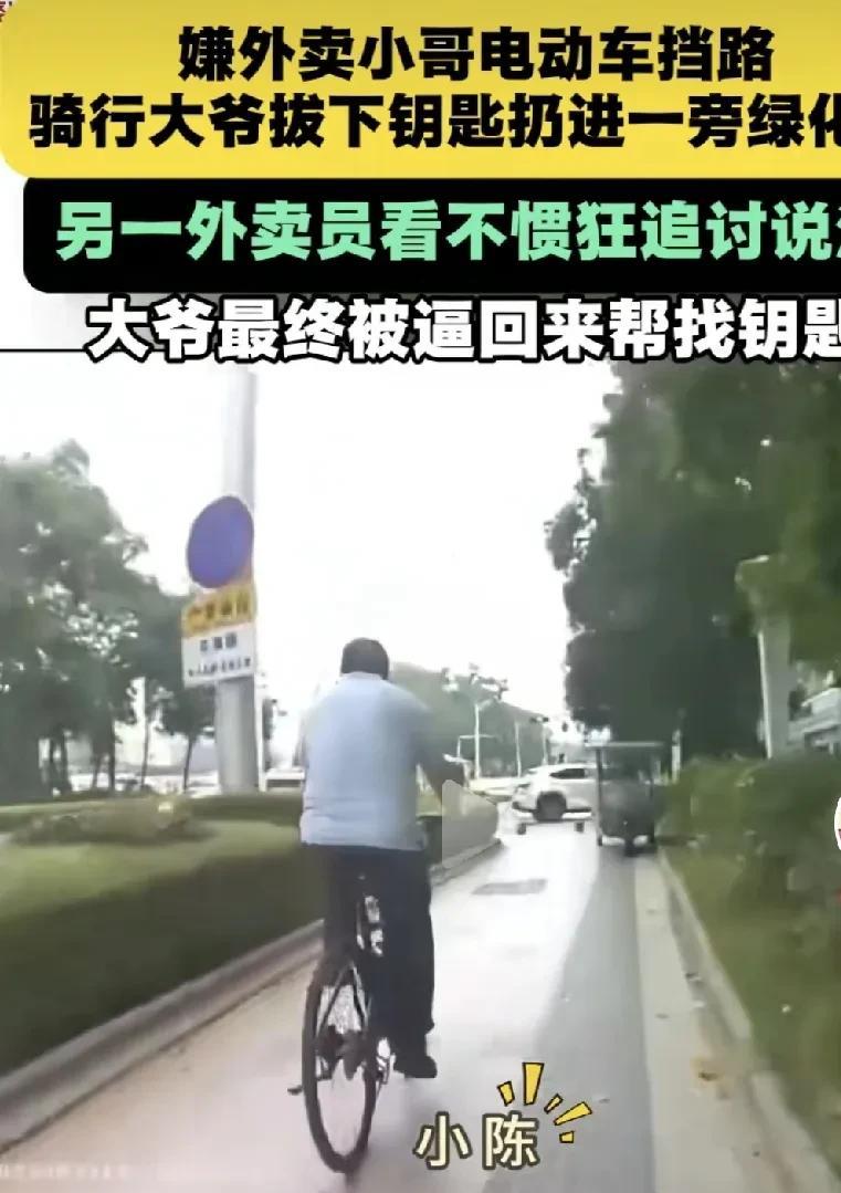 山东青岛一大爷,骑着自行车在马路上走。 突然前面一辆外卖小哥的电动车挡住了去路,大爷心里很不爽,只能下自行车,一瞅,车钥匙还在电动车上呢,大爷心里一阵爽,我叫你乱停车,挡我去路! 边想边拔下了车钥匙,一抬手就扔进了绿化带里。 大爷这一举动正好被一个大姨看见了,正好路人小陈路过,大姨以为这是小陈的电动车,就指了指刚骑上自行车的大爷说,你车钥匙让他给扔绿化带了。 小陈一听,有这事,我必须要管,马上去追大爷,边追边问,是你把人家钥匙扔绿化带了吧? 你赶紧给人家找回来,人家一天送个外卖容易吗?挡你路是他不对,你也不能把人家钥匙扔了吧。 大爷根本没听那个,还往前骑呢。 最后小陈报了警,叔叔来了,迫于压力,大爷不得不回来拔开绿化带去找被他扔掉的钥匙。 大爷就是大爷呀,手段是真不一般呀。大姨看不惯但做了善意提醒,小陈路见不平,追回大爷找车钥匙。 估计外卖小哥下次说啥也得拔了车钥匙再走了吧。
