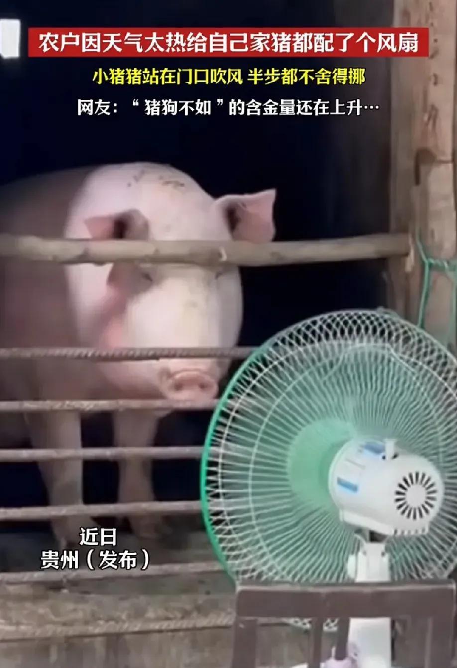 难怪外国人说,活的还不如中国的一头猪!贵州有个女的,家里养了一头猪。最近天气太热,她妈妈怕猪中暑,就买了台风扇给猪吹。那猪吹着风扇,脸上的表情看着还挺享受。 其实那些大猪场里的猪,待遇更好。不光有大型风机,带崽的母猪还能一头猪配一台电风扇。有时候人中暑了都还好说,猪可不能中暑。育肥场是全封闭的,有水帘和风机,夏天待在猪场里都不想出来。现在的猪过得是真幸福,吃的都是最好的饲料,冬天暖和夏天凉快,就是寿命短了点,一般只有半岁就得去上餐桌。
