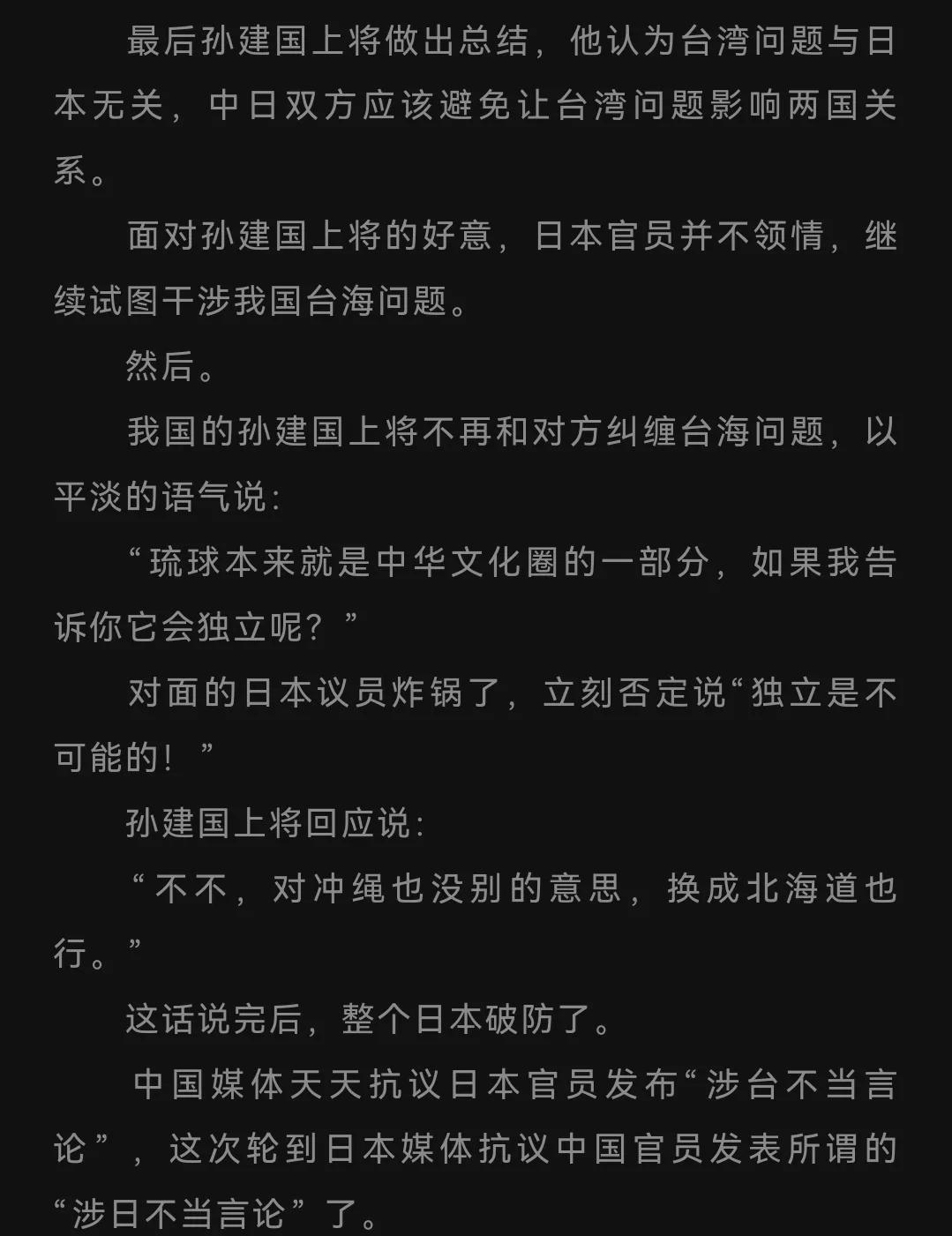 我就说孙将军的语气不可能这么软的,琉球不需要讨论,北海道也不需要,日本的本土我们几十年前的驻军权还没执行