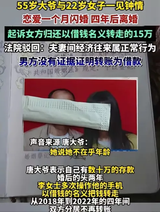 55岁唐大爷和22岁李女士的"忘年恋"堪称魔幻——相识一个月闪婚,甜蜜期一过就开始为钱撕破脸。四年婚姻里李女士转走15万,离婚时大爷想要回这笔钱,法院却判:婚姻存续期间的共同花销,无需返还!