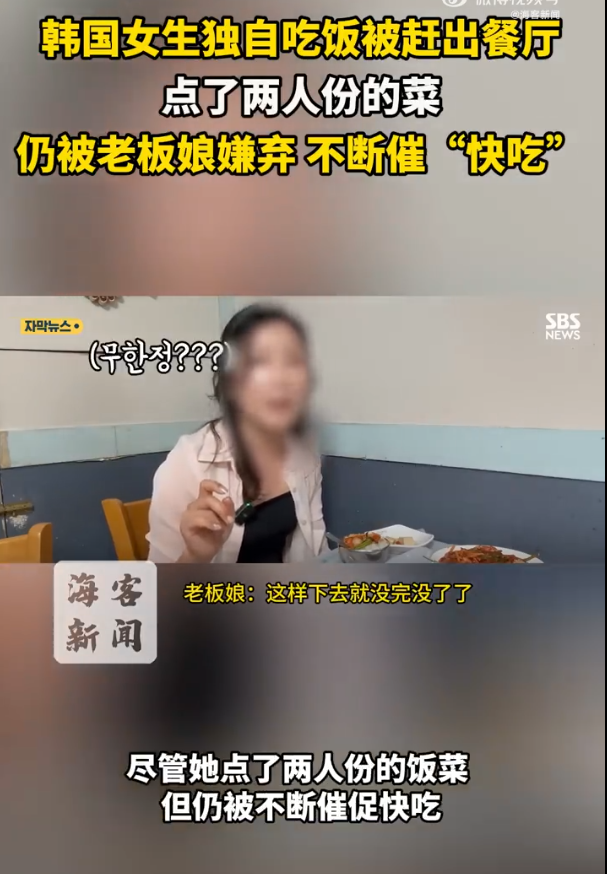 ,韩国一名女子在全罗南道丽水市一家网红店吃饭时,因独自就餐,遭老板娘无礼对待。尽管她点了两人份的饭菜,但仍被不断催促快吃,最终无奈提前结束用餐含泪离开。事件曝光后,引发众怒。