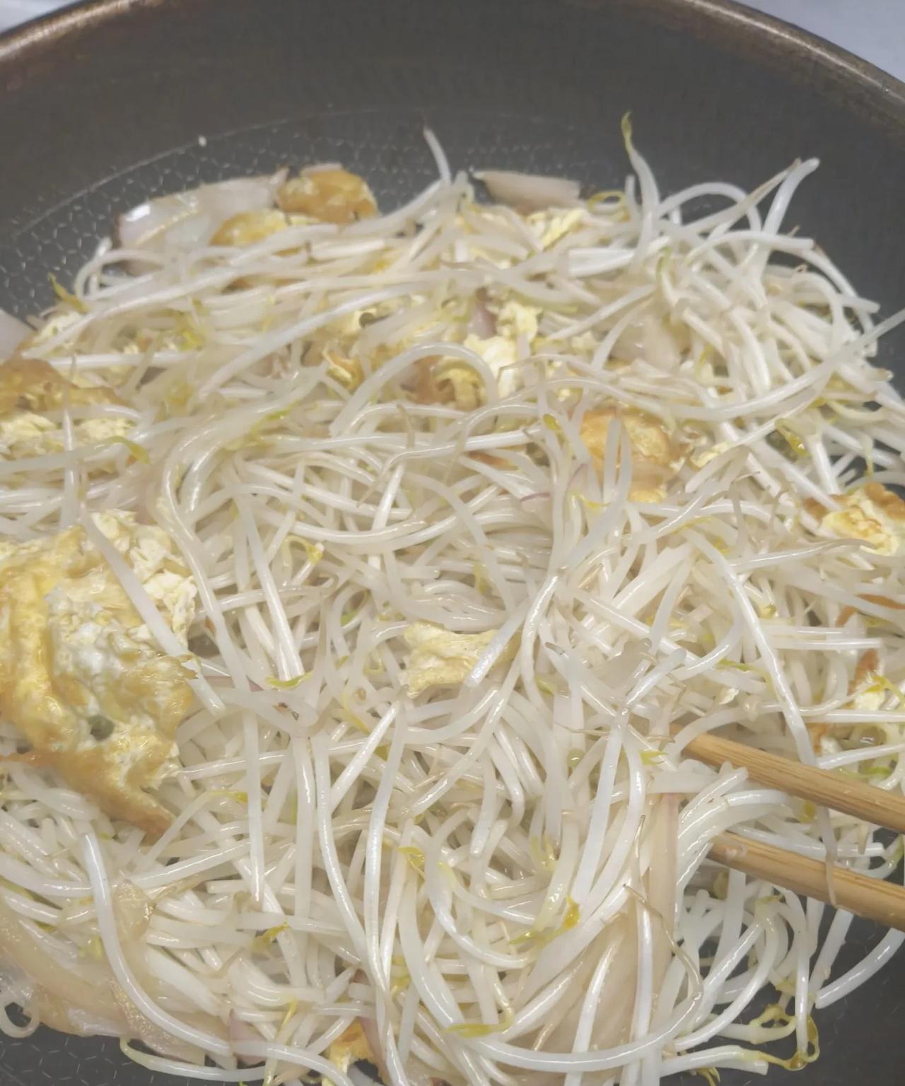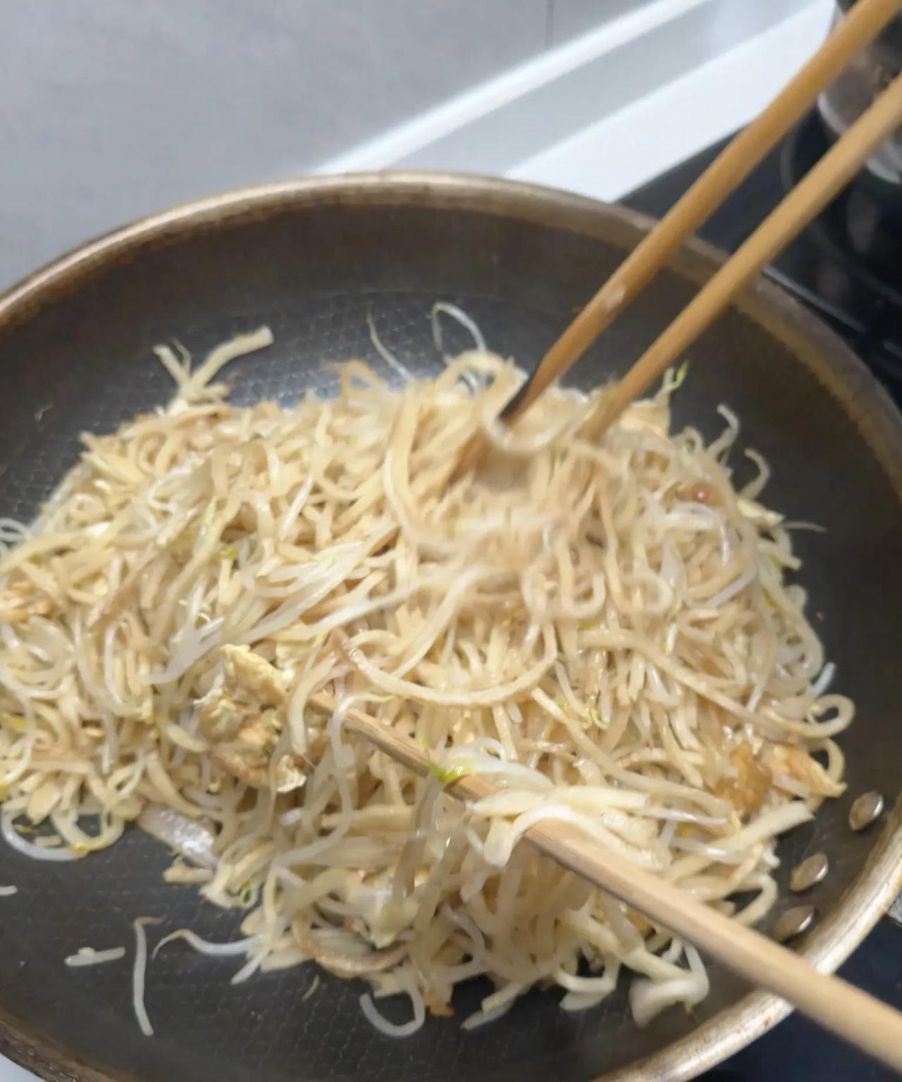 今天下小雨了。中午还在发愁吃什么饭!妻子说,好长时间没吃炒饼了,简单点吧,就吃素炒饼丝。 素炒饼丝相信很多朋友都喜欢吃,又方便又快捷又简单。我出去到菜店买了一块钱绿豆芽,两块钱饼丝。鸡蛋家里有存货。