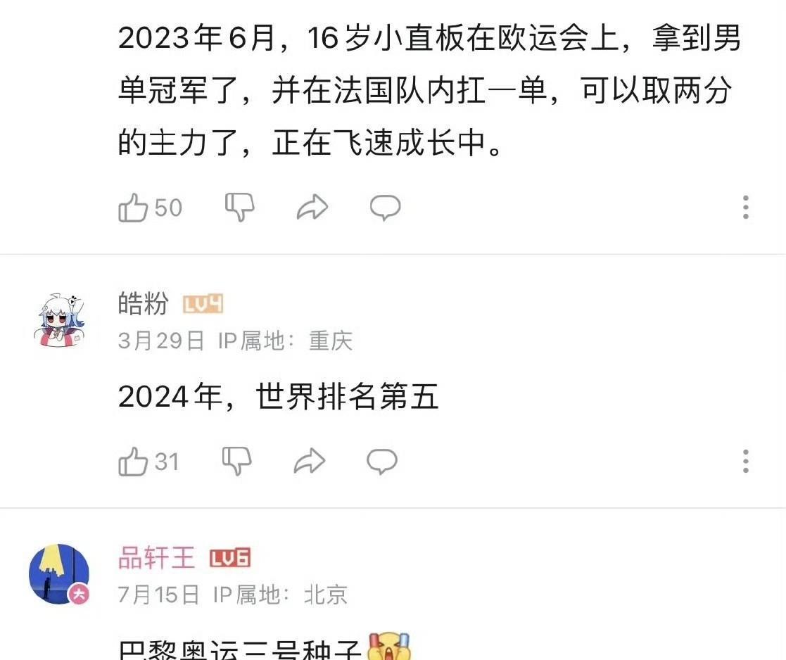 全世界都有在默默关注小直板费利克斯·勒布伦的成长。连王皓看见他得分,黑黝黝的脸上,都忍不住笑了一下。 在小布的早期比赛视频下面,有一层楼记录下了小布的职业生涯的每一个重要节点。 2019年3月14日,网友感叹:希望几年以后,能看见这个直板小朋友开始闪耀。 当时的小勒布伦13岁,是个小胖企鹅,输了比赛,假装面无表情,一直憋到教练旁边,开始哇哇大哭。 2021年12月4日,有网友在评论下面更新了他的新动态:15岁的小勒布伦已经很强了,刚刚赢了庄智渊。 2022年8月20日,有网友总结了小布个人新的里程碑,他正式杀入了法国的主力层,在布达佩斯赛上,已经是法国第三主力。 这年的小布16岁。 一年以后,评论区里又多了一条新动态:不满17岁的小直板,在欧运会狂砍两分,扛起法国队的大旗,勇夺男团冠军。 2024年3月29日,一位皓迷带来震撼人心的消息:小直板的世界排名来到了世界排名第五。 五个月后,不满18岁的小勒布伦,以巴黎奥运会三号种子的身份,出征职业生涯首次奥运之旅。 当他走到了四强时,评论区再次沸腾,此时,小勒布伦离颁奖台还有一步之遥。 终于,自2012年伦敦奥运会的王皓之后,时隔12年,又有个小直板,骄傲挺起胸膛,站上了单打颁奖台。 2024年10月,小勒布伦在蒙彼利埃冠军赛贡献了战神级别的表现,成为了WTT冠军赛史上最年轻的单打冠军。 而在刚落幕的美国大满贯上,小勒布伦用强悍的直板反手,和王楚钦的横板正手中远台惊艳对拉,还拉穿得了一分后,王皓都忍不住笑了一下。 之前有个热帖是“直板已死”,而帖子的最新热评已不是众志成城地唱衰,而是“直板的未来,要看技改后的小勒布伦能走到哪里。” 费利克斯·勒布伦:假以时日,我必让直板重登巅峰! 法国小直板,出生于2006年9月12日,还有两个月才满19岁。他的首次奥运成绩:男单铜牌,团体赛全程一单,关键场次,一单两分,帮助法国夺下历史首枚团体赛铜牌。 这次真的是“未来可期”了。