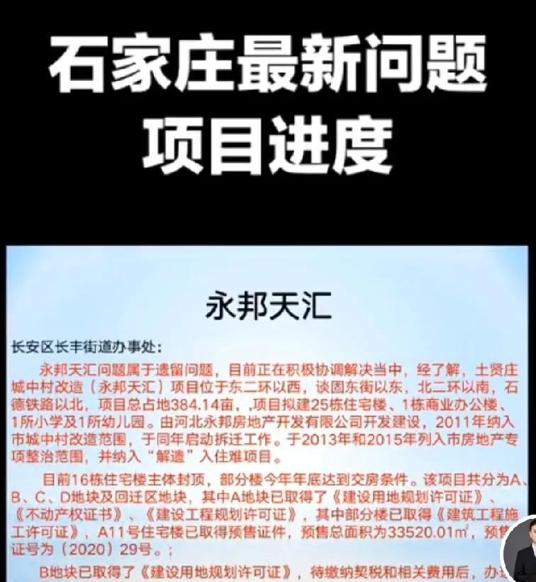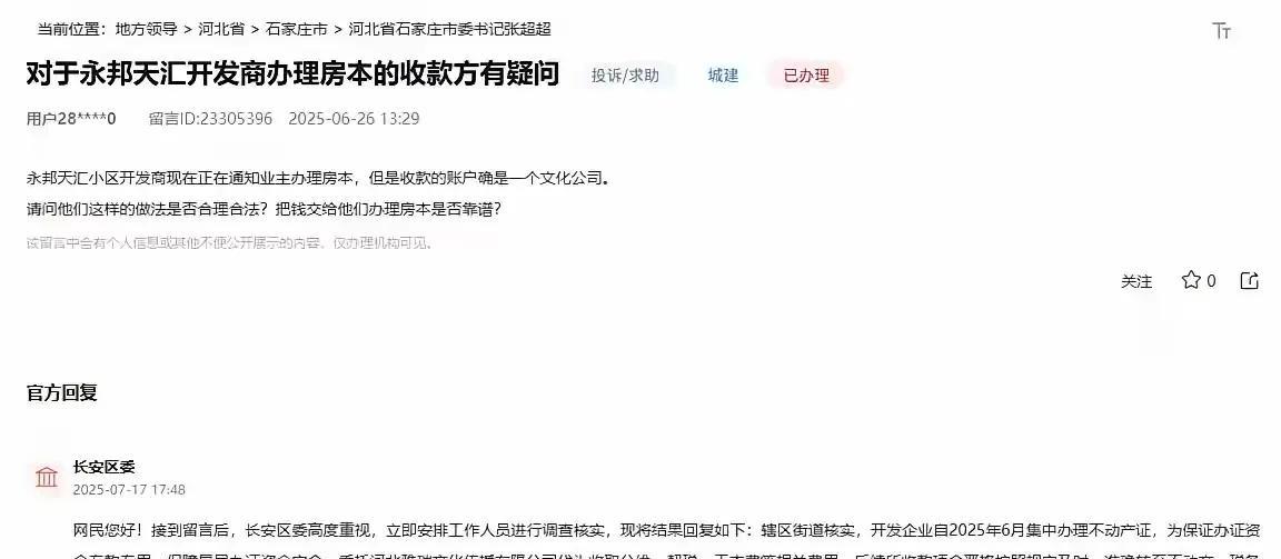 从网上查询可知,石家庄永邦天汇小区的开发商是河北永邦房地产开发有限公司,公司自6月份开始集中为业主办理不动产证。 6月26日,有业主在人民网领导留言板块向石家庄市委书记张超超留言“对于永邦天汇开发商办理房本的收款方有疑问”,同时也引发网友关注。 7月17日,长安区委回复“为保证办证资金专款专用,保障居民办证资金安全,委托河北雅瑞文化传播有限公司代为收取公维、契税、工本费等相关费用”。 据悉,永邦天汇属于历史遗留问题,项目位于东二环以西,2011年纳入城中村改造项目,同年启动拆迁工作。2013年和2015年被列入市房地产专项整治范围,并纳入“解遗”入住难项目。