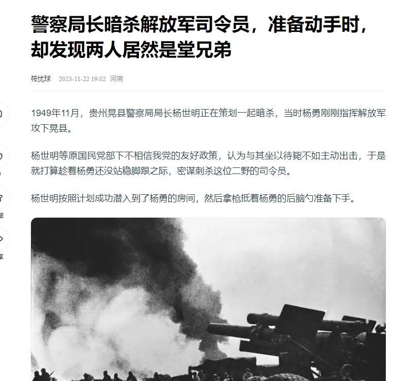 1949年11月,解放军司令员杨勇回到房中,却突然感到一把枪顶在脑后。他回首一望,竟发觉来人是自己的哥哥杨世明,而其竟是奉命前来刺杀自己的。 1949年11月,晃县万籁俱寂。解放军司令员杨勇结束了一天的军事会议后,拖着疲惫的身躯返回住处。突然,一把手枪抵住他的后脑,冰冷的枪口透着杀意。转身一看,持枪者竟是他的堂兄杨世明!这位奉命刺杀的哥哥为何对亲人下手?背后隐藏着怎样的恩怨与抉择?这场惊心动魄的兄弟对峙,不仅牵动亲情,更关乎革命的命运,故事的真相令人屏息。 杨勇于1913年诞生在湖南浏阳文家市镇的一户普通农家。家中一贫如洗,仅以种田维持生计,日子过得颇为拮据。他从小就机灵,13岁就加入了中国少年先锋队,14岁入了共青团,1930年正式参加红军,同时成为共产主义者。 红军时期,他从宣传队员干起,很快当上了连政治委员,参与了中央苏区的反“围剿”战斗。长征路上,他带队冲锋,突破湘江封锁线,攻占娄山关,立下不少功劳,1934年还得了三等红星奖章。 抗日战争中,他加入八路军115师,担任686团副团长、团长兼政委,参加了平型关战役,战绩显赫。到了国共内战,他指挥晋冀鲁豫野战军第一纵队,1949年初升任第二野战军第五兵团司令员,带队解放了衢州、景德镇等20多座城市。他身经百战,五次负伤,身上伤疤无数,但从没退缩过,性格果断,指挥沉稳,部队里都敬他三分。 杨世明比杨勇大几岁,是堂兄,同样出身浏阳穷苦人家。小时候两兄弟一起在田里干活,关系挺铁。后来,杨世明背井离乡外出闯荡,欲谋求一条出路,却阴差阳错地进入了国民党警察队伍。他在国民党治下混得不容易,警察队伍里多是地痞流氓,欺负人、捞油水是常事。 杨世明没啥背景,吃了不少苦,靠着韧劲和一点机缘,慢慢爬到了晃县警察局局长的位子。1949年,他负责晃县治安事宜,麾下有数十人。然国民党腐败至极,他工作得极为憋屈,日子亦颇为艰难。眼见解放军兵临城下,他置身其间,陷入两难之境。 1949年10月,新中国刚成立,西南地区还是国民党残部的地盘,贵州、四川一带聚集了90多万残兵败将,勾结土匪,负隅顽抗。中央军委决定由贺龙率军南下,配合第二野战军,彻底清剿西南的国民党势力。刘伯承、邓小平亲自指挥二野,采取“大迂回战略”,从湘西、贵州边界进攻,避开国民党重兵布防的秦岭。杨勇的第五兵团任务明确:从湘西晃县沿湘黔公路直插贵阳,切断国民党军逃往云南的退路,再北上解放重庆。晃县为关键一站。驻守于此的国民党警察及其残部早有耳闻:解放军来势汹汹,传言将清剿一切旧势力。 杨世明在晃县听到这些消息,压力山大。国民党残部煽风点火,说杨勇铁了心要赶尽杀绝,手下警察人人自危。杨世明不想坐以待毙,决定冒险一搏。他熟悉晃县地形,又摸清了杨勇的住处,打算趁夜潜入解放军营地,干掉司令员,以乱敌军阵脚。他带着几名心腹,摸黑潜入,藏在杨勇的房间附近,伺机行动。杨勇刚结束会议,毫无防备,独自回房。杨世明瞅准时机,持枪上前,枪口直抵杨勇后脑,准备动手。 杨世明潜入前,偷听了杨勇的军事会议,得知他在追查晃县的国民党残部,语气坚决,似乎不留余地。这让他更加认定必须除掉杨勇,以保手下活命。可当他举枪对准杨勇时,杨勇认出了他,喊了一声“世明哥”。这一声让杨世明愣住了,多年未见的兄弟情涌上心头,手指僵在扳机上。杨勇趁机稳住局面,放下武器,开始交谈。杨世明坦白了自己的处境:国民党警察队伍乌烟瘴气,他被逼无奈才走上这条路。杨勇则耐心解释,共产党对归降人员从宽处理,只要放下武器,就能改过自新。 杨世明带来的几名警察也陆续现身,气氛从紧张转为复杂。杨勇没急着抓人,而是摆事实讲道理,指出土匪路是死胡同,害人害己。他提到中央的政策,凡放下武器的国民党人员,都可既往不咎,或收编或返乡。杨世明听后动摇,想到手下兄弟的家庭,想到老母亲的期盼,决定投诚。 天亮后,杨世明带着手下走出营地,交出所有枪支弹药。杨勇亲自安排,允许他们继续在晃县维持治安,但必须接受解放军指挥,立功赎罪。杨世明提出不当警察局长,想加入解放军随军作战。杨勇却劝他留在晃县,熟悉地形人脉,正适合整顿地方秩序。几天后,38军摩托部队抵达晃县,杨世明的警察部队配合解放军,清理国民党残部据点,减少了战斗伤亡。11月4日,第五兵团16军攻占天柱,国民党军望风而逃。杨勇率部冒雨急行军,九天后解放贵阳,彻底切断国民党军退路。 贵阳解放后,杨勇挥师北上,11月30日攻占重庆市郊南温泉。蒋介石父子仓皇逃往成都,国民党军心涣散,纷纷起义或投降。12月23日,国民党司令胡宗南弃军逃往海南,12月30日,成都和平解放,大西南战役画上句号。杨勇战功赫赫,1950年1月开始担任贵州军区司令员兼省人民政府主席,1955年荣膺上将军衔,他与杨成武、杨得志一同被称为新中国的“三杨”。