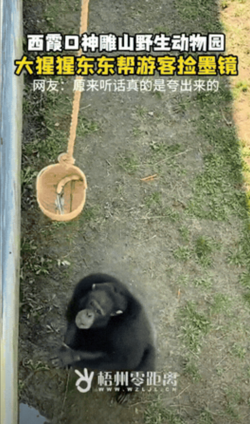 太有灵性了!山东威海,游客在猩猩馆前拍照时,墨镜不小心掉进了园里。游客本以为墨镜拿不回来了,可饲养员不慌不忙,放了个筐子下去。