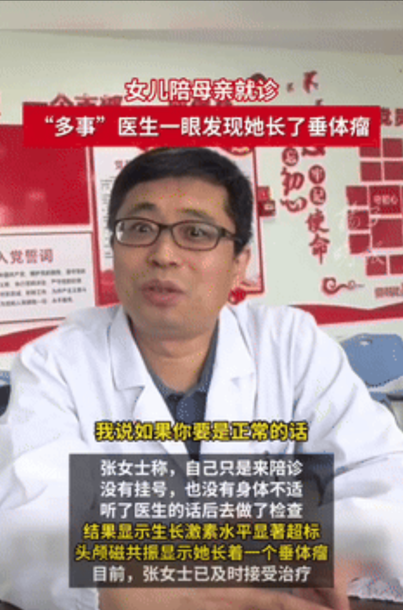 “这名医生火了!”江苏苏州,一女子带着口罩陪母亲到医院就诊,没想到,医生却看出她长了垂体瘤,可女子连脸都没露出来,医生仅凭她的眉骨就察觉异常,眼见女子不相信,医生表示让她去检查一下,如果是正常的话,40元诊断费他报销! 据扬子晚报7月18日消息,女子来医院的主要目的就是给母亲检查身体,她没感觉身体不适,但医生却说她得了病,女子怎么都不愿相信。 生病都是有征兆的,她和医生隔那么远,就露个额头和眼睛就能诊断出问题,这听起来太不可思议了,但女子心里还是产生了一丝怀疑。 医生平常接触的病人很多,经验多了,其中的技巧肯定掌握了,医生站在女子的角度,知道她的顾虑是什么,无非就是怕花钱,最后发现自己一切正常,那钱谁来报销? 为了预防女子的病情愈发严重,医生向她做出保证,女子这才愿意去检查,事实证明医生是对的,如果没有医生的“慧眼”,说不定女子还蒙在鼓里。 等她发现说不定就晚了,医生为了救人也是豁出去了,如果这事处理不当,很有可能会造成医患纠纷,但医生宁愿承担后果,也要帮助女子。 最终女子决定留在医院接受治疗,这名医生还时不时去她所在的病房看望她,医生真正做到了医者仁心,将患者排在第一位,如果不是他的坚持,不知道等待女子的将是什么。 对于这件事情,大家有什么看法?