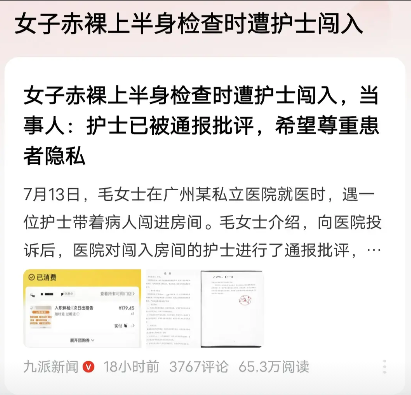当时,毛女士顿感不舒服,觉得自己被冒犯到了,因为她光着上半身,出于隐私也不想被他人看到,可是,护士突然闯入让她感到屈辱。