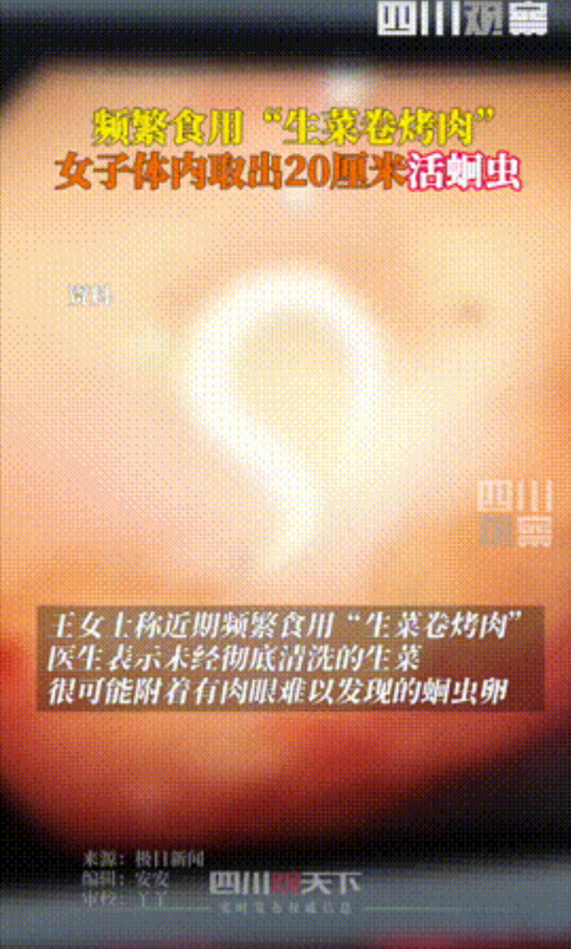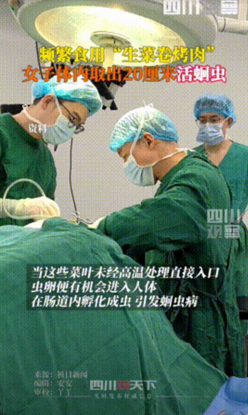 “啥都吃的代价!”湖北,一女子近期肚子总是疼,严重影响了生活和工作,于是就到医院检查,结果做肠镜时,医生竟看到里面有条20厘米长的蛔虫!随后一问才知道,竟是女子特殊的吃饭习惯惹的祸! “当看到肠镜的那一刻我瘫坐在了地上,今后一定不敢再乱吃东西了!”女子心有余悸的说道,这句话,源自湖北十堰市一位58岁王女士的真实经历,而她身上发生的故事,也给我们敲响了饮食卫生的警钟。 王女士是一位热爱生活的普通女性,平日里喜欢和家人朋友一起聚餐,尤其是最近,她迷上了“生菜卷烤肉”这道美食,她觉得生菜包裹着烤肉既解腻又健康,每次聚餐都少不了这一道菜,然而,从几个月前开始,王女士的肚子却开始时不时地疼起来,起初她以为只是普通的肠胃不适,并没有太在意。 随着时间的推移,疼痛越来越频繁,甚至严重影响了她的日常生活和工作,王女士开始变得消瘦,食欲也大不如前,她常常在深夜被疼痛惊醒,第二天又因为无法集中精神而耽误工作,在家人的一再劝说下,她终于下定决心去医院做个检查。 来到十堰市人民医院消化内镜科,王女士向医生描述了自己的症状,医生考虑到她的腹痛已经持续了很长一段时间,建议她做一次肠镜检查,王女士虽然有些紧张,但还是同意了。 检查过程并不复杂,但当肠镜探查进入她的肠道时,医生发现了一条正在蠕动的长条形寄生虫,这一发现让在场的所有人都大吃一惊,医生立即根据形态学鉴定,确认这是一条蛔虫成虫,为了进一步确认,医生使用活检钳小心地将这条长约20厘米的蛔虫完整取出,令人庆幸的是,后续检查并未发现其他活虫。 术后王女士被给予了口服药物驱虫治疗,随着体内的蛔虫被清除,她的腹痛症状明显缓解,人也逐渐恢复了精神,然而当她得知自己体内竟然有一条这么大的蛔虫时,仍然感到十分后怕。 在王女士身体逐渐恢复后,医生开始追查蛔虫感染的源头,经过仔细询问,医生发现了一个关键细节:王女士近期频繁食用“生菜卷烤肉”,这一饮食习惯立刻引起了医生的警觉。 原来,王女士在吃生菜卷烤肉时,生菜往往只是简单冲洗,并没有经过彻底的清洗,而这些生菜在生长过程中,可能因为土壤、水源等原因沾染了蛔虫卵,当这些生菜和烤肉一起被吃进肚子里,蛔虫卵便在王女士温暖舒适的肠道里安家落户,逐渐孵化成成虫。 这一事件在网上引发了广泛的讨论,许多网友纷纷表达了自己的看法,一位网友评论道:“看到这个新闻我真是吓了一跳!我一直以为生菜卷烤肉是很健康的吃法,没想到里面竟然藏着这么大的隐患,以后吃生菜前一定多洗几遍。” 另一位网友则说:“我平时也喜欢吃生菜卷烤肉,看完这个新闻后我决定彻底改变饮食习惯,不仅生菜要彻底清洗,烤肉也要确保完全熟透,健康才是最重要的,以后再也不会为了贪图一时的美味而忽视健康了。” 王女士的经历给我们上了一堂生动的健康教育课,在这个看似繁华、美食琳琅满目的时代,我们更应该时刻保持警惕,注意饮食卫生,保护好自己的健康,毕竟健康才是人生最大的财富,而良好的饮食习惯,则是守护健康的第一道防线。 对此你怎么看?欢迎大家在评论区留言讨论。