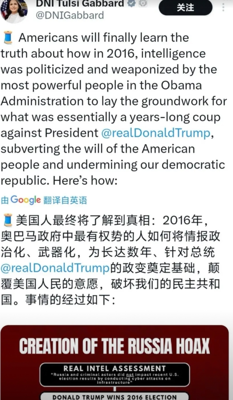 目前美国情报总监图尔西给出的说法,通俄门是奥巴马一手伪造的,计划是发动政变不把总统位置给特朗普,让希拉里接位可以成为美国总统,延续民主党的统治。