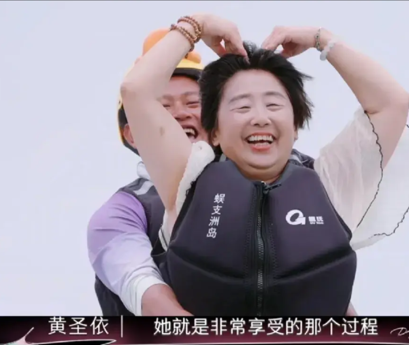 30岁的陈梦在玩水上飞龙时,被吓得一直尖叫,五官乱飞,74岁的黄圣依妈妈在玩水上飞龙时,却一脸享受,完全不害怕,还开心的和陈梦等人互动。