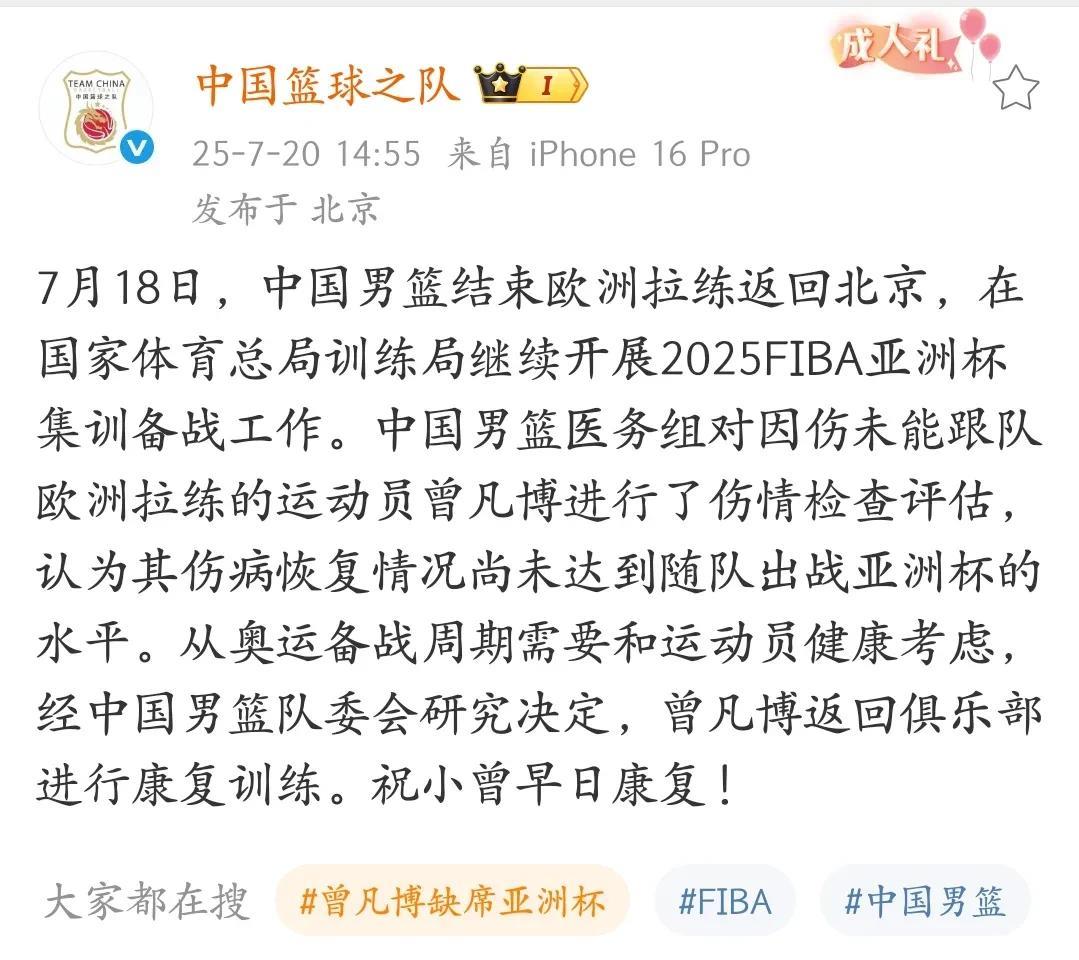 中国男篮一好一坏两消息,女篮丢掉亚洲杯冠军后,给男篮留的喘息空间真的不大了! 中国篮球官方消息:曾凡博的伤病在重新评估后,仍然无法达到亚洲杯的水平,所以不再参加后续训练!也间接确认曾凡博无缘8月份的亚洲杯!至此因伤退出国家队的有周琦、张镇麟和曾凡博这三名主力球员,让内线和锋线的实力大大受损! 于此同时杨瀚森在NBA结束了全部夏季联赛的比赛,表现良好的小杨基本确定要回来参加亚洲杯了,也算解决点燃眉之急吧,但是这也会直接影响他的调整和休息,从CBA季后赛结束后将近3个月了他还没休息过! 男女篮的亚洲杯其实意义并不大,如果说女篮冠军还能获得一个世界杯名额,那么男篮亚洲杯就是纯纯的鸡肋比赛,不涉及任何世界杯和奥运会参赛资格,就是为了亚篮联赚钱! 但就是因为女篮亚洲杯的失利,不可能同时让男女篮在这个夏天都输的太难看,所以只好牺牲杨瀚森的时间了!中国篮球这个夏天不好过啊!#中国篮球# #曾凡博确定缺席亚洲杯# #杨瀚森# #曾凡博# #中国男篮#