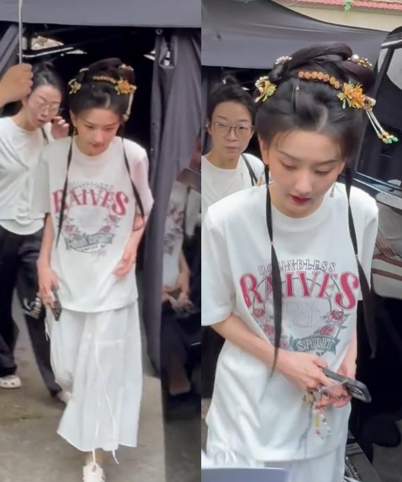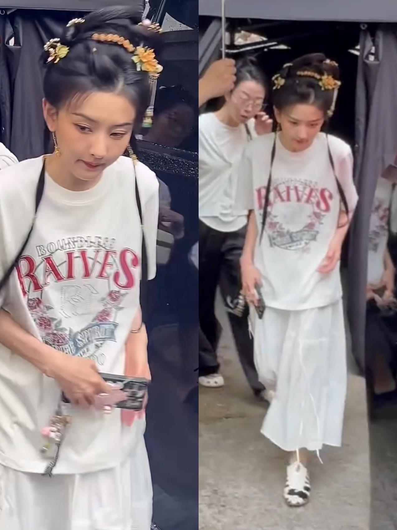 宋祖儿新剧发型变了好好看,拍戏日常穿搭。宋祖儿7.20上班穿搭,T恤配白裙子很可