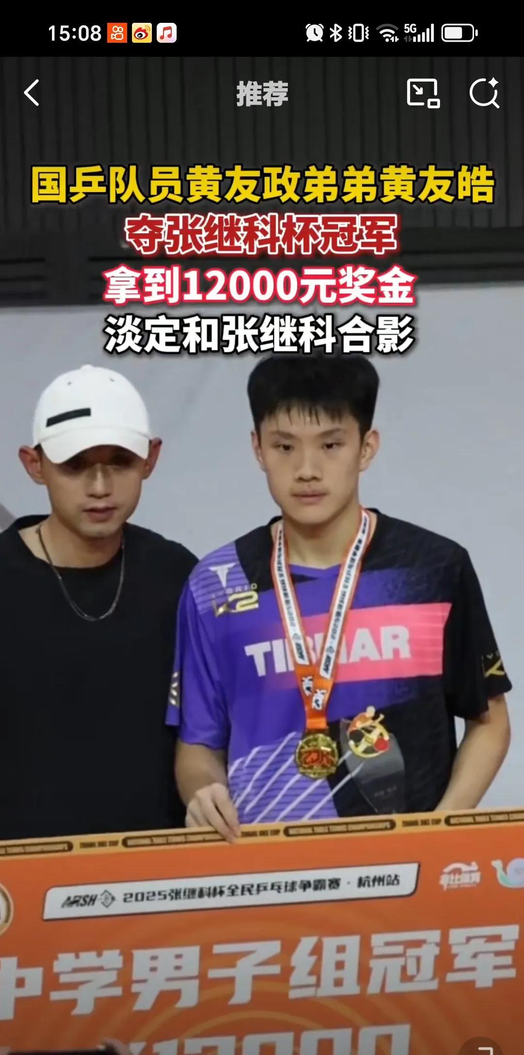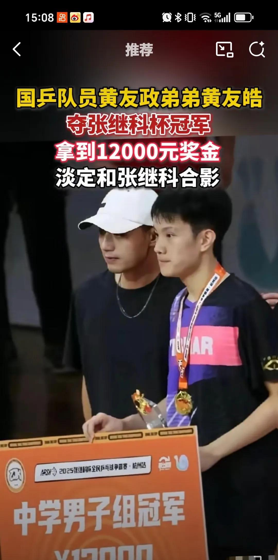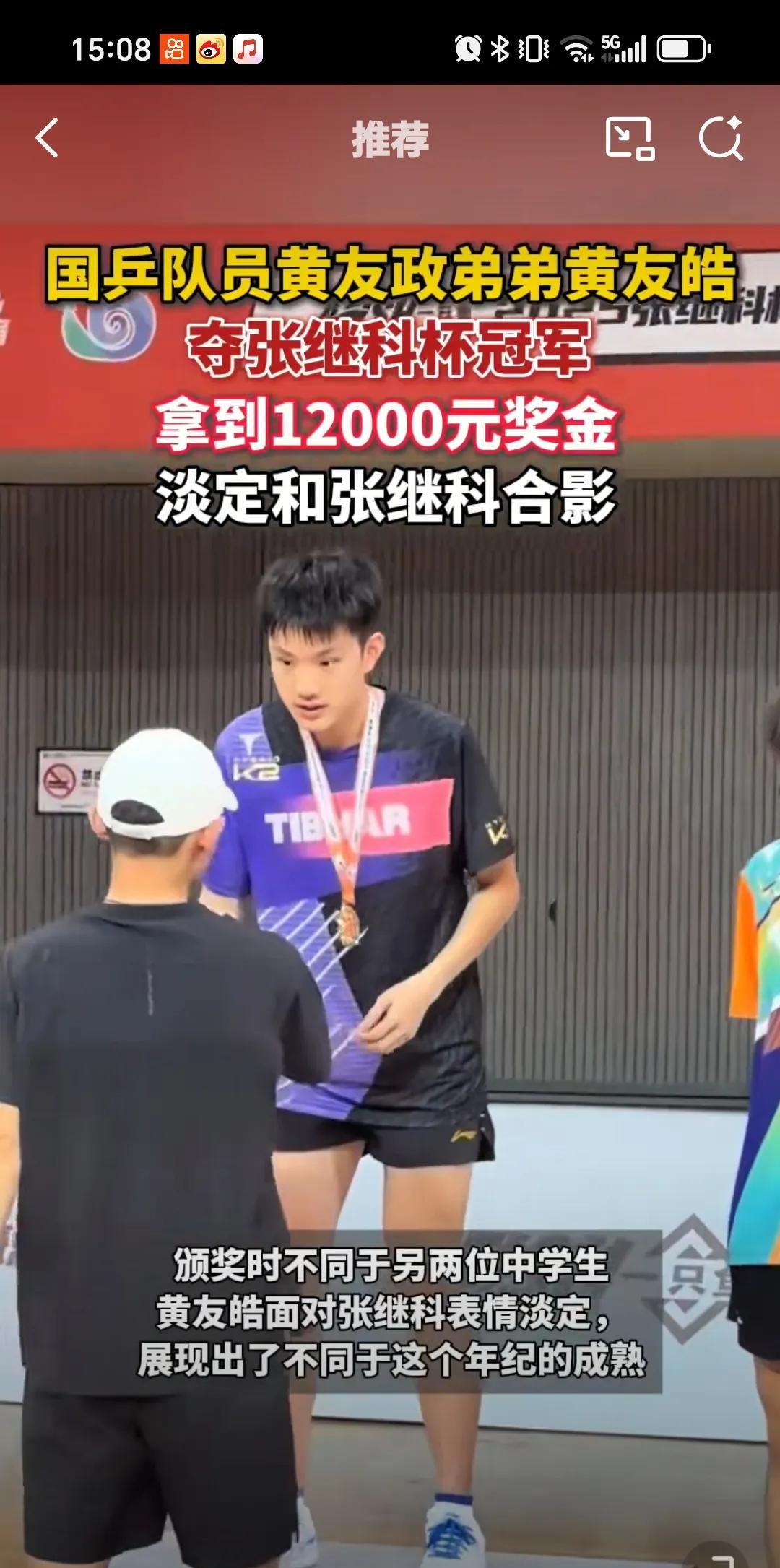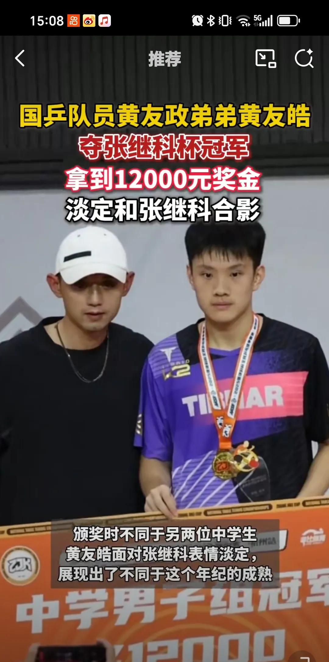 7月20日恭喜黄友政弟弟黄友皓夺得张继科杯冠军,并和张继科淡定合影留念。黄友政和弟弟长的不太一样,但是神韵还是有点相似,弟弟好像张本智和的样子。感觉弟弟以后的成就可能比哥哥黄友政更好。 因为眼神更坚毅,黄友政感觉是个性格很好的男孩子,但是感觉没那么好胜心强。但是体育就是要自信和想赢。 我看好黄友皓,因为年轻还有就是张继科杯应该集齐很多人才,他能赢说明实话很强。