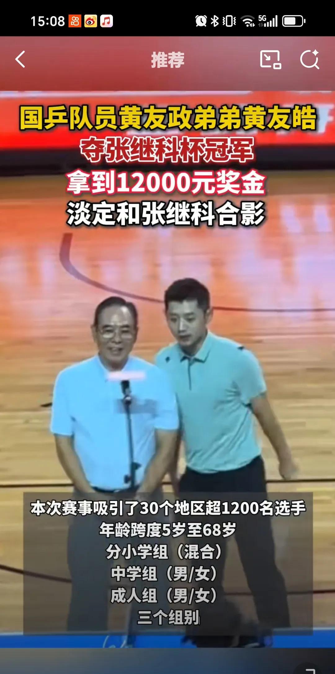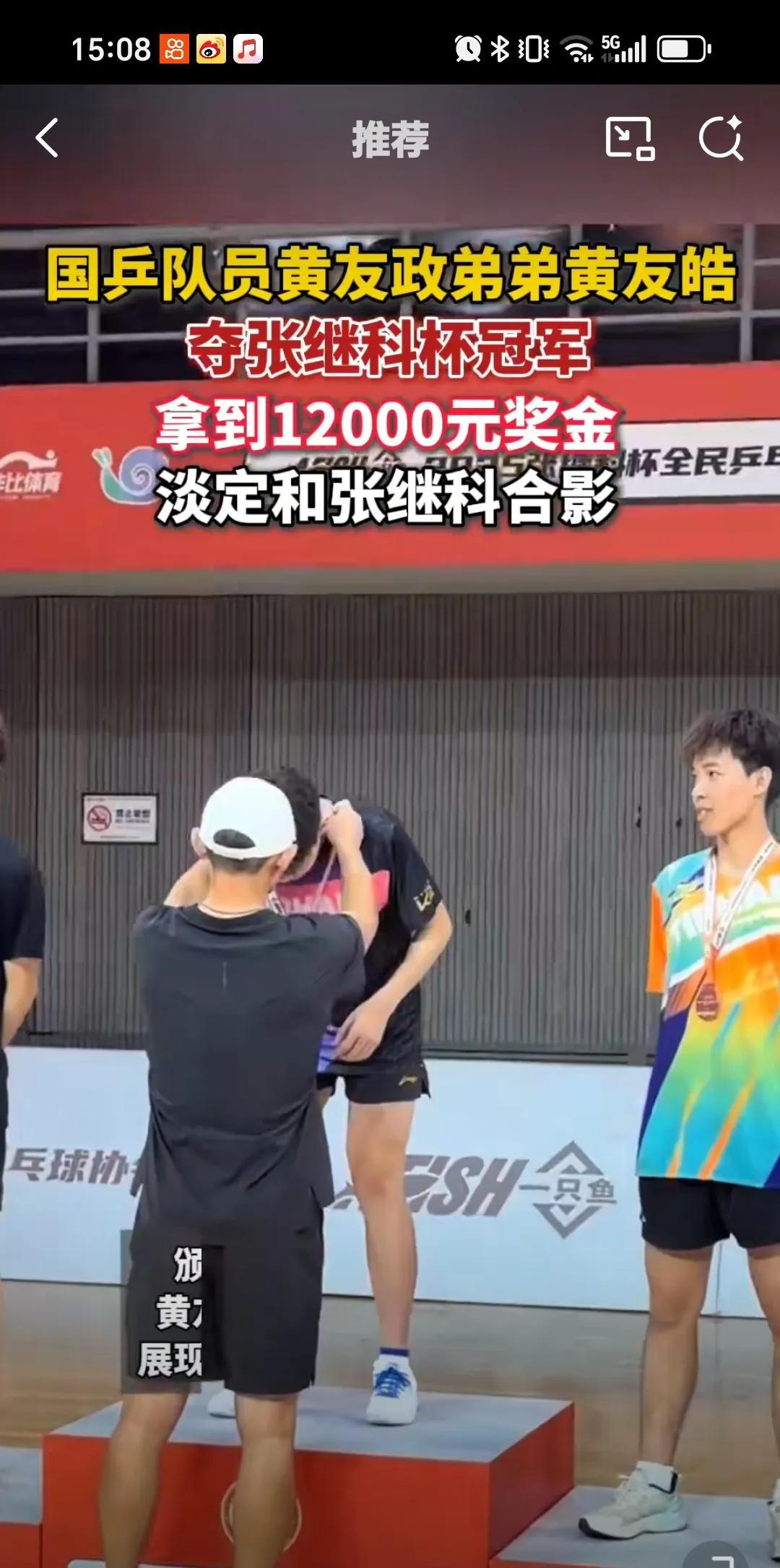 7月20日恭喜黄友政弟弟黄友皓夺得张继科杯冠军,并和张继科淡定合影留念。黄友政和
