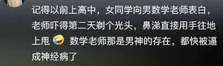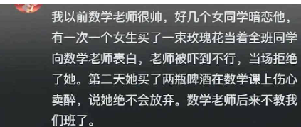 我高中数学老师就因为有女学生喜欢他被教导主任批评过。还好那时候没有女拳。而他也火速有了女朋友避免了进一步麻烦。180帅哥每天骑摩托上班。