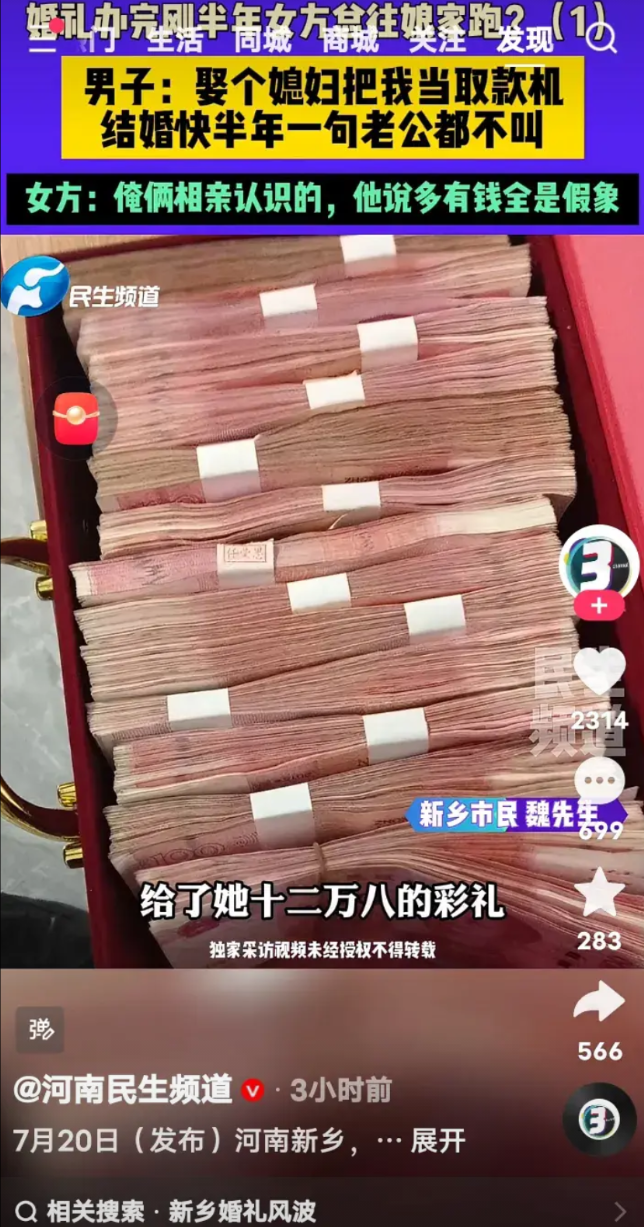 人家记者采访,她就说别人这不好,那不好,别人不好,你不结啊,你要定亲钱彩礼钱干什么?钱花了,结婚证不愿打,不愿意打,别人又不好,你把钱和三金全退给人家啊,还整天找别人要钱干嘛?还让人家到北京打工挣钱给你花,真是想得太美了,空手套白狼,把男人当提款机啊。