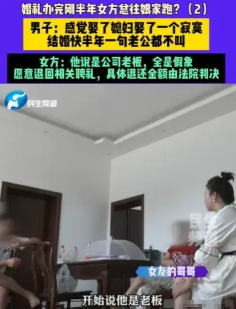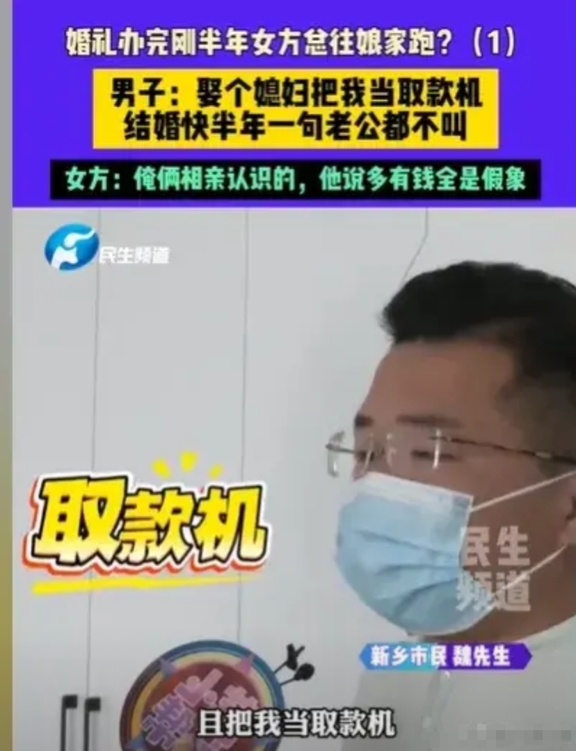 河南新乡,男子给了新婚妻子101,000元现金,128,000元彩礼,还有五金,可妻子刚结婚半年,就老往娘家跑,把他当取款机,让他去挣钱,分一半钱给她花,还不领证,说等有了孩子再领,先玩一年再说,半年也没有叫过他一声老公,他去找妻子,妻子却说:结婚前,他就装得有多有钱,实际上这都是假的。
