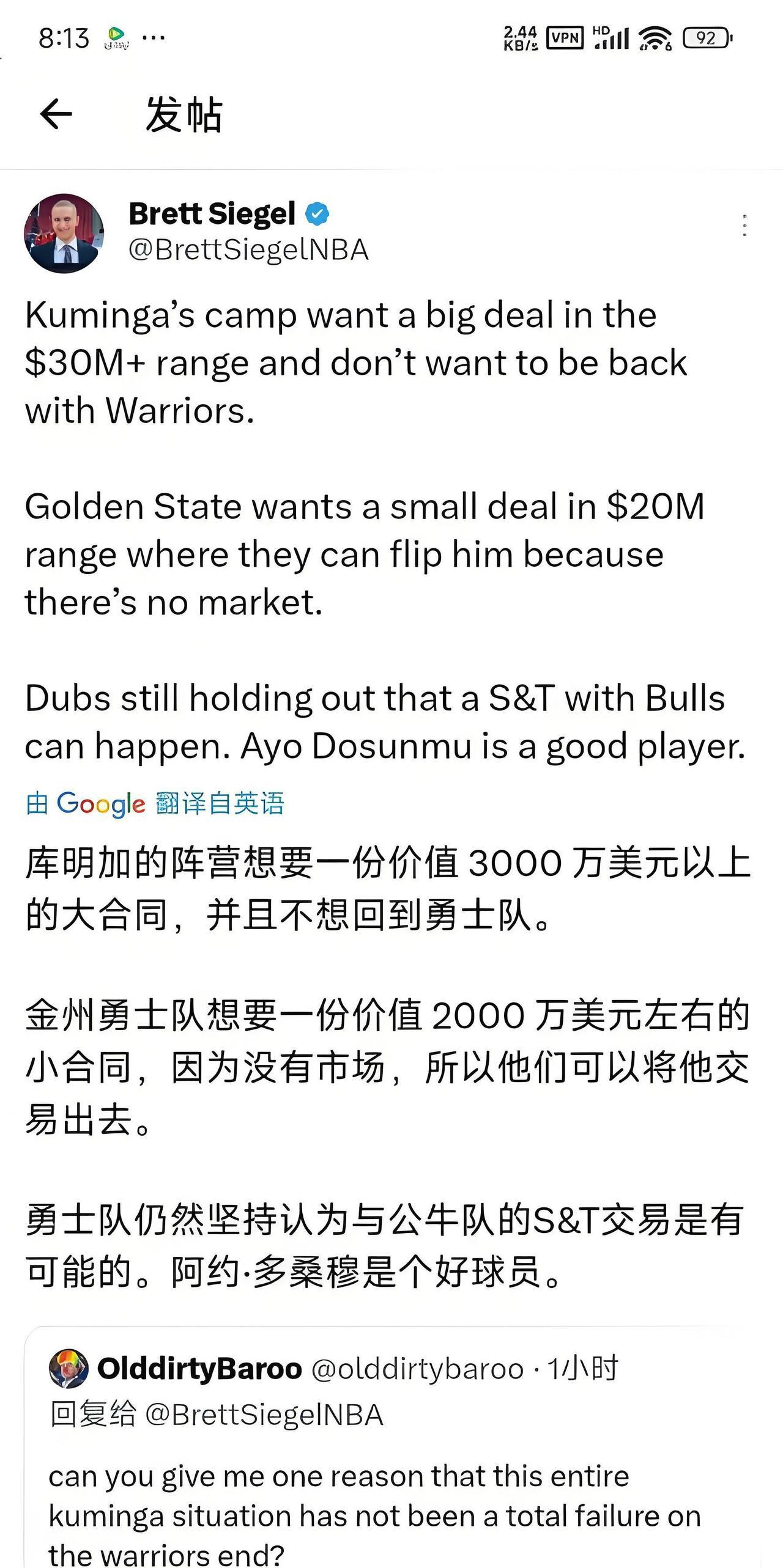勇士今夏引援停滞,库明加续约僵局成主因,勇士去年在库明加拒绝那份价值3000万美元的提前续约报价时,就应考虑放其离队! 休赛期至今,勇士队在自由市场上尚无任何签约或续约动作,核心阻碍在于安德鲁·库明加的续约谈判陷入僵局!双方分歧巨大: 1、库明加团队: 寻求一份年薪远超3000万美元的长期合同,且离队意愿明显,不愿意再为勇士队打球! 2、勇士队: 倾向于提供一份年薪约2000万美元的合同,主要目的是便于后续交易操作——但目前缺乏实质性的外部报价。勇士仍在探索与公牛队进行先签后换交易的可能性,目标球员是后卫阿约·多森姆,这被视为目前最有可能的解决方案之一!