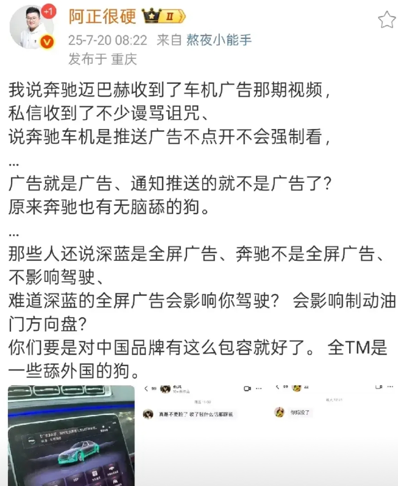 奔驰这是在挑战底线啊!根据博主爆料,奔驰迈巴赫的车机居然出现了广告。 博主将这一消息发到了网上,没想到竟引来了谩骂,这些人的逻辑实在有些让人难以理解。 看这个广告弹窗,似乎是推送的奔驰自家的优惠活动。广告弹窗挡住了车机的状态栏,要是在行驶途中去关闭广告弹窗,会分散驾驶员的注意力,从而影响行车安全。