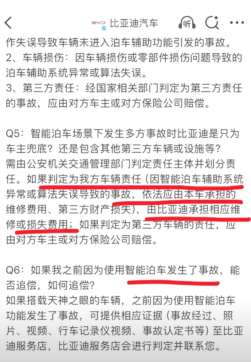 今天有人跟我咨询比亚迪的L4级别泊车辅助是不是吹牛? 我觉得,是不是L4的核心,还是看责任方在哪? 目前各个主流车企的泊车辅助,已经可以脱手脱眼了,区别不大。 主要区别在于,脱手后,责任归谁? 比亚迪这个很坦诚啊: 1,脱手泊车产生的事故,比亚迪承担 2,如果造成第三方损失,是本车责任的,归比亚迪承担。 3,比亚迪车主过去的泊车事故,如果是车的问题,比亚迪承担。 完全没问题,放心用。 1比亚迪承诺为智能泊车安全兜底