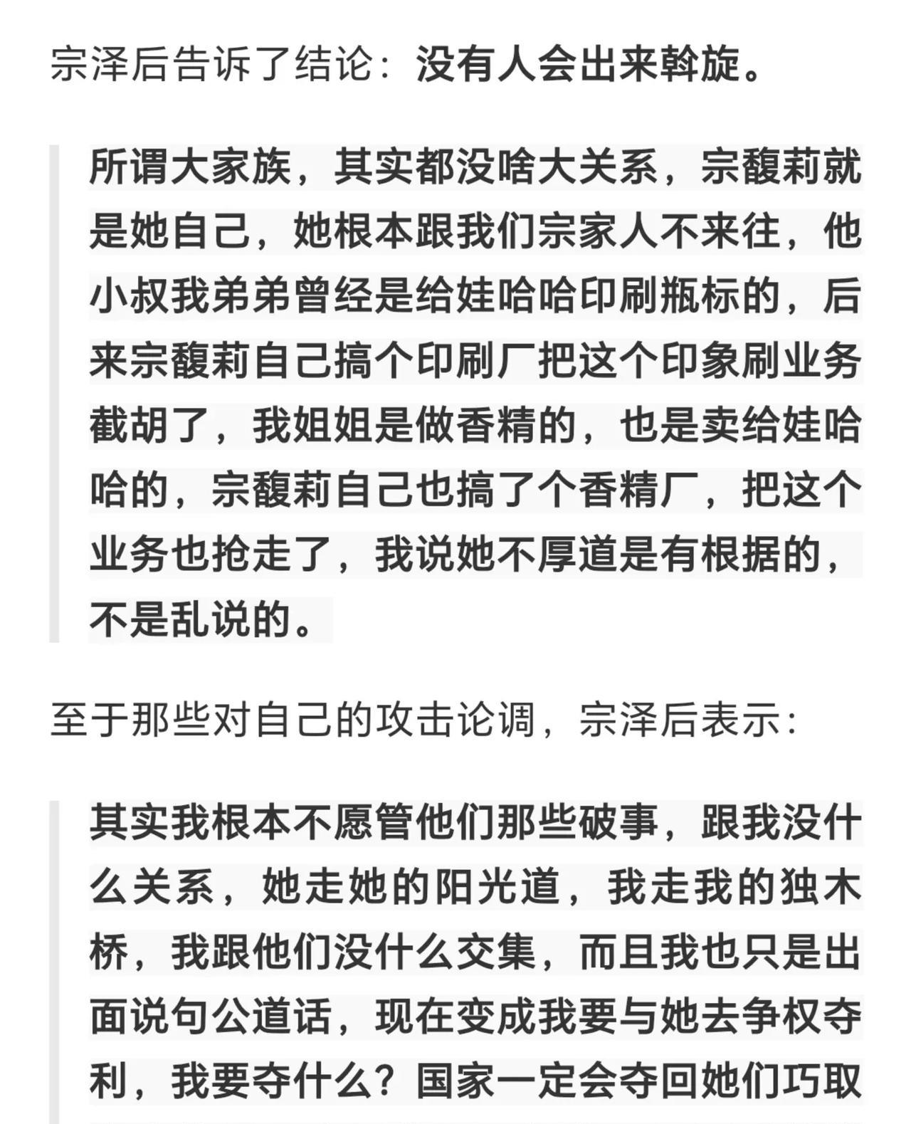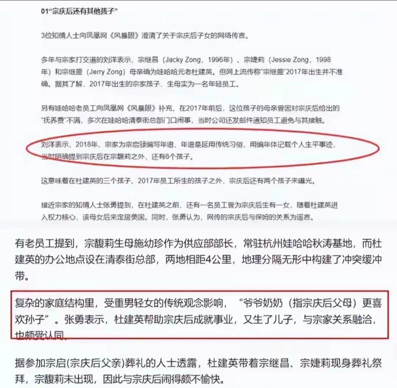 网上说浙江不重男轻女看来也不可信!宗馥莉和宗家人不亲,那是因为宗家重男轻女,让外室子孙入族谱,捧灵牌与骨灰。 宗泽后在接受采访时,对宗馥莉怨气极大,认为亲侄女找水军,给宗庆后立人设,也谈到宗馥莉和宗家人不亲,抢了家族其他人的饭碗。 宗庆后一妻一女不是他自己说的吗? 在好多年前接受采访问他子女入籍国外,他还否认了呢,那时候他的私生子就已经入外籍了。 因此说宗馥莉找水军给父亲立人设,根本就站不住脚。 另外,从宗家知情人所透露的信息,宗馥莉爷爷奶奶更喜欢外室给他们宗家生了孙子,宗家人与外室关系也很密切。 这让宗馥莉以及她母亲情何以堪? 一个出轨生下的私生子,比正妻生的孙女更受到宗家人的喜爱,宗馥莉会对宗家这种重男轻女的行为,无动于衷吗。 这也能解释了宗馥莉她为什么频繁更换司机、保姆等身边人,甚至在冰箱都要装摄像头。 宗馥莉缺乏安全感,她要防备身边的人,不会背叛她。 因此,宗馥莉与宗家人关系不好,并不像网上所说的那样,是她自私、六亲不认、不好相处、做事极端。 宗家其他长辈重男轻女的表现,让宗馥莉对这些所谓的家人亲属没有归属感,她需要将本该属于自己的一切(父亲的遗产),牢牢抓在手中,给不给同父异母的弟妹分点,要由她自己说了算。