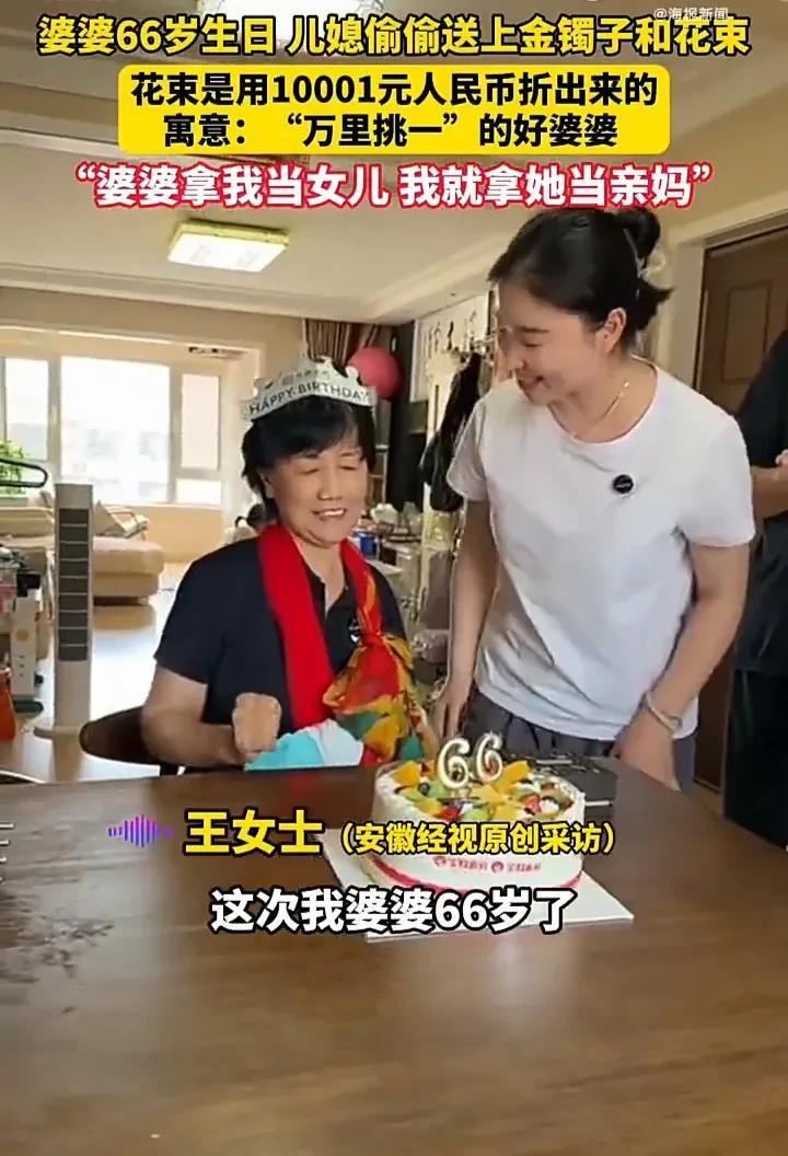 谁说儿媳和婆婆一定关系不好!7月20日,北京一位婆婆过66岁生日,儿媳特意去银行取了10001元百元大钞,寓意百里挑一,然后亲手折成一朵巨大的花束,再买了一个金镯子,一起送给婆婆,她说婆婆把她当女儿,她就把婆婆当亲妈。