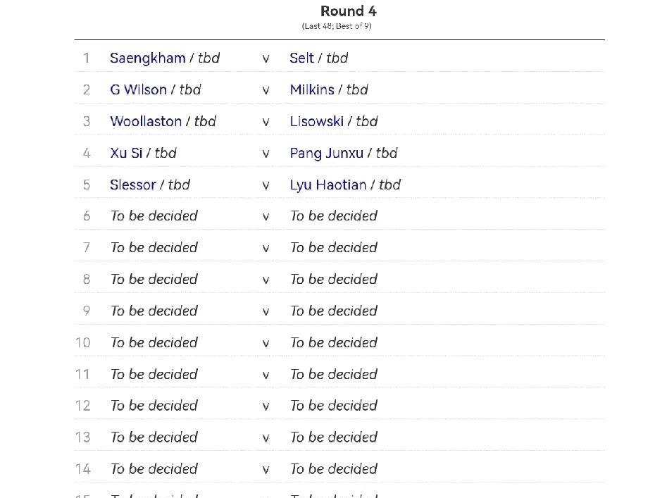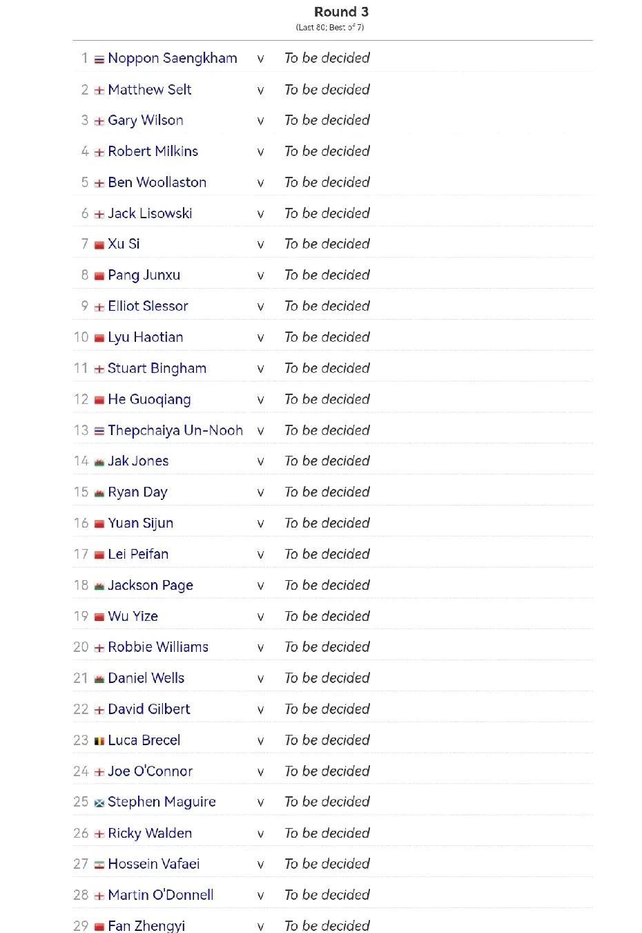 肖国栋、白雨露缺阵沙特大师赛,有点遗憾,因为两人要参加成都世运会,赛程冲突。 昨天,沙特大师赛抽签对阵已经公布,TOP16选手肖国栋和女子世锦赛冠军白雨露缺阵,原因是两人要参加成都世运会台球项目比赛,之前两人被中国台球协会征召,代表中国队参赛,比赛时间为8月10-14日。 沙特大师赛是排名赛,一共有144名球员参赛,斯诺克巨星齐聚沙特吉达,其中包括卫冕冠军特鲁姆普、世锦赛冠军赵心童、“火箭”奥沙利文、希金斯、凯伦·威尔逊、马克·威廉姆斯、墨菲、艾伦、丁俊晖、尼尔·罗伯逊等。 这项首次登陆沙特吉达的赛事将于8月8日至16日在阿卜杜拉·阿尔费萨尔王子体育城的绿色大厅举行,目前对阵名单已正式公布。 第一轮出战的中国球员有11人(见图三)其中有一场傅家俊与常冰玉的德比;第二轮出战的中国球员有5人(见图四);第三轮出战的中国球员有9人(见图五),top16中的4名中国球员丁俊晖、赵心童、张安达、斯佳辉将在第五轮出战(见图七)。 WST(世界斯诺克巡回赛)官网报道称,这项史诗级赛事已迅速崛起为斯诺克“第四大赛”,与历史悠久的三大满贯赛事齐名。总计144名选手将角逐桂冠,其中包括16位来自中东地区的外卡选手。 特鲁姆普将以卫冕冠军身份出战。去年那场惊心动魄的决赛中,他在决胜局完成斯诺克史上最伟大清台之一,在落后62分的情况下轰出72分绝杀马克·威廉姆斯,最终10-9夺冠。 外卡选手代表了沙特及周边地区最顶尖的斯诺克人才,包括: 1.奥马尔·阿拉贾尼(沙特) 2.阿卜杜勒拉乌夫·赛义格(沙特) 3.齐亚德·阿尔卡巴尼(沙特) 4.艾哈迈德·阿西里(沙特) 5.阿迪尔·阿克达斯(巴基斯坦) 6.阿西夫·穆赫塔尔(巴基斯坦) 7.哈比卜·苏巴(巴林) 8.海瑟姆·沙基(埃及) 9.穆罕默德·阿尔乔克(阿联酋) 沙特大师赛总奖金再度突破200万英镑,冠军将获得与世锦赛等值的50万英镑。完整奖金分配如下: 冠军:50万英镑 亚军:20万英镑 四强:10万英镑 八强:5万英镑 16强:3万英镑 32强:2万英镑 48强:1.1万英镑 80强:7000英镑 112强:4000英镑 144强:2000英镑 147满分杆:5万英镑 总计:230.2万英镑 2024年赛事八强选手、前世界冠军尼尔·罗伯逊表示:“去年所有球员都收获了美妙体验,那里的练球设施是我见过最顶尖的。整个赛事完美无瑕,144名选手同场竞技的氛围令人振奋。” 尼尔·罗伯逊说,“我喜欢体验多元文化,中东之旅充满惊喜。随着球迷热情高涨,我们球员更要奉献精彩表现。如今斯诺克已成为真正的全球巡回赛,期待未来能看到更多中东新秀。” 据WST介绍,沙特大师赛前5日将设置8张比赛球台,球迷可观赏众多球星轮番登场——每张球台下午和晚间各进行两场比赛。8月14日进行1/4决赛,15日为半决赛,16日周六将上演巅峰对决。