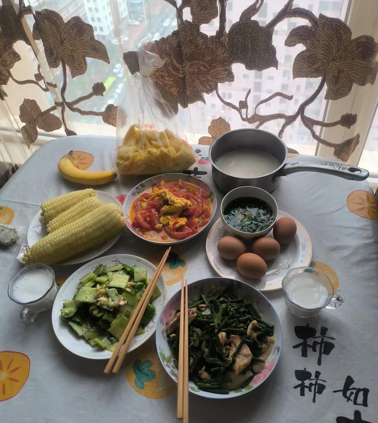 73年出生,23年退休,退休金2721元,身高168,体重124.9斤的我,一早起晚了。 起来就去冰箱翻偷懒神器,蒸上馒头和饺子,又煮了几穗苞米[偷笑] 老公做菜[大笑]做了一个长豆炒五花肉(长豆1.99元一斤,五花肉14.8元一斤),一个小白菜肉汤(小白菜1元一斤),一个炒西红柿,一个拌黄瓜菜(黄瓜0.99元一斤),够吃足矣[偷笑] 煮几个鸡蛋,热点牛奶,还有昨儿买的蛋糕边[偷笑] 简简单单,又是一餐,平平淡淡才是真,又是新周,顺遂健康好运[比心]