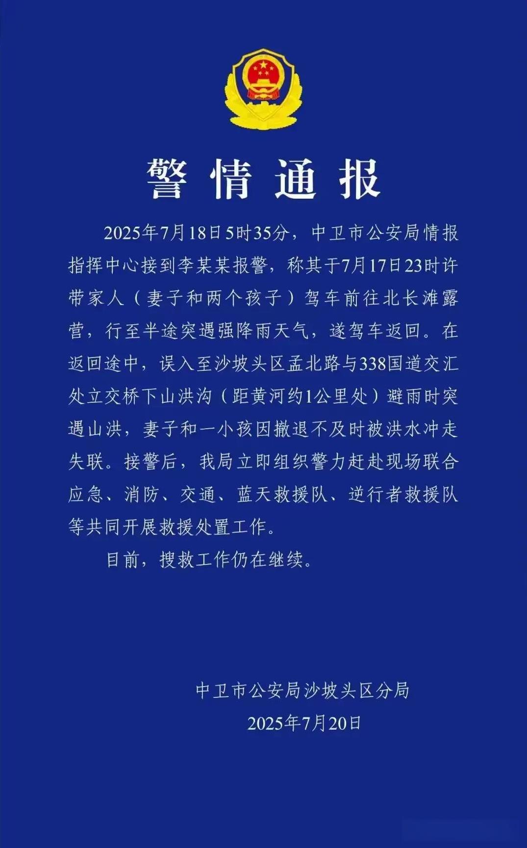 河南男子深夜自驾带家人露营,为躲避降雨到立交桥下避雨,不幸遭遇山洪,两人被山洪冲