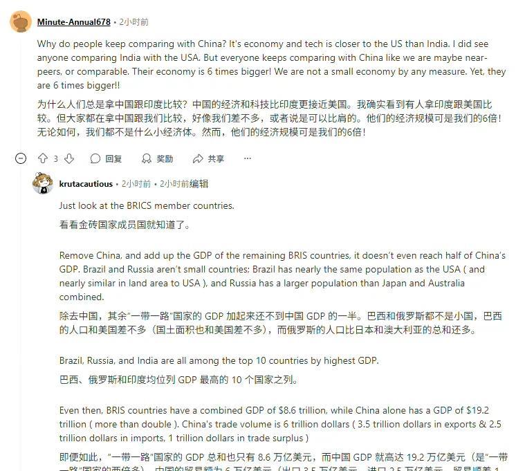 印度最近几家外卖平台很火,有人拿中国的外卖规模跟印度对比,结果印度人破大防,又开始讨论起为什么印度不如中国的原因。 印度人并不是像大家想的那样,全部都无知自大,实际上印度人也会反思,不过反思的点不对,他们把自己失败的原因归咎于人口太多。 甚至还有印度人说中国人口少,资源多,印度没有办法,从这也可以看出印度人受教育程度太低。 不过把经济问题归咎到人口问题上,我记得以前国内很多人也是这样想的,一说发展不起来就是人口太多,如果跟美国一样只有4亿,那么中国就是发达国家,现在这样说的人就很少了。 所以你看,印度的认知仍然停留在20年前中国的水平。