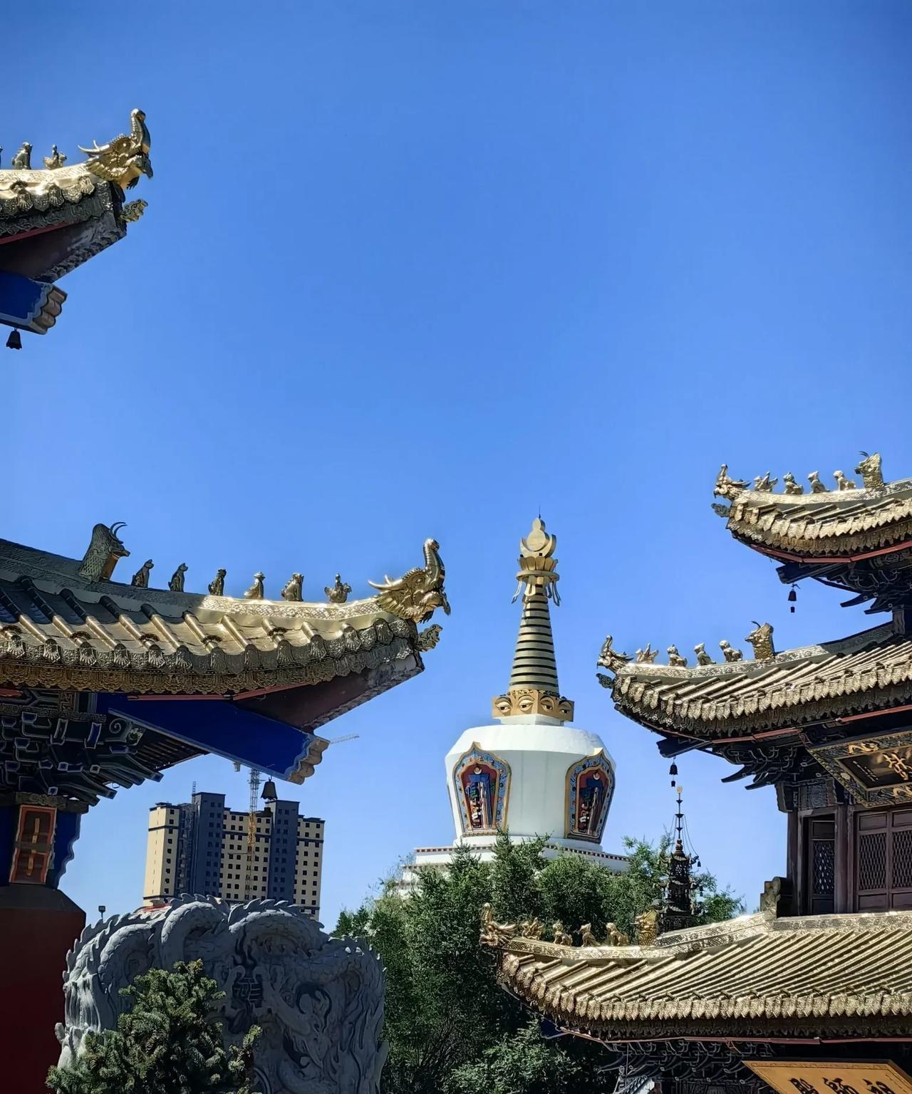 退休生活:结束旅行,晒晒我拍的照片。 上周四,我和妹妹继续逛呼市的各个寺庙,寺庙是呼市的一大特色。 我俩逛了观音寺,从观音寺出来,站在观音寺大门,隔着马路遥望对面的白塔,感觉飞檐楼阁间白塔耸立,画面很美,于是用手机拍了下来。 #旅行随手拍#