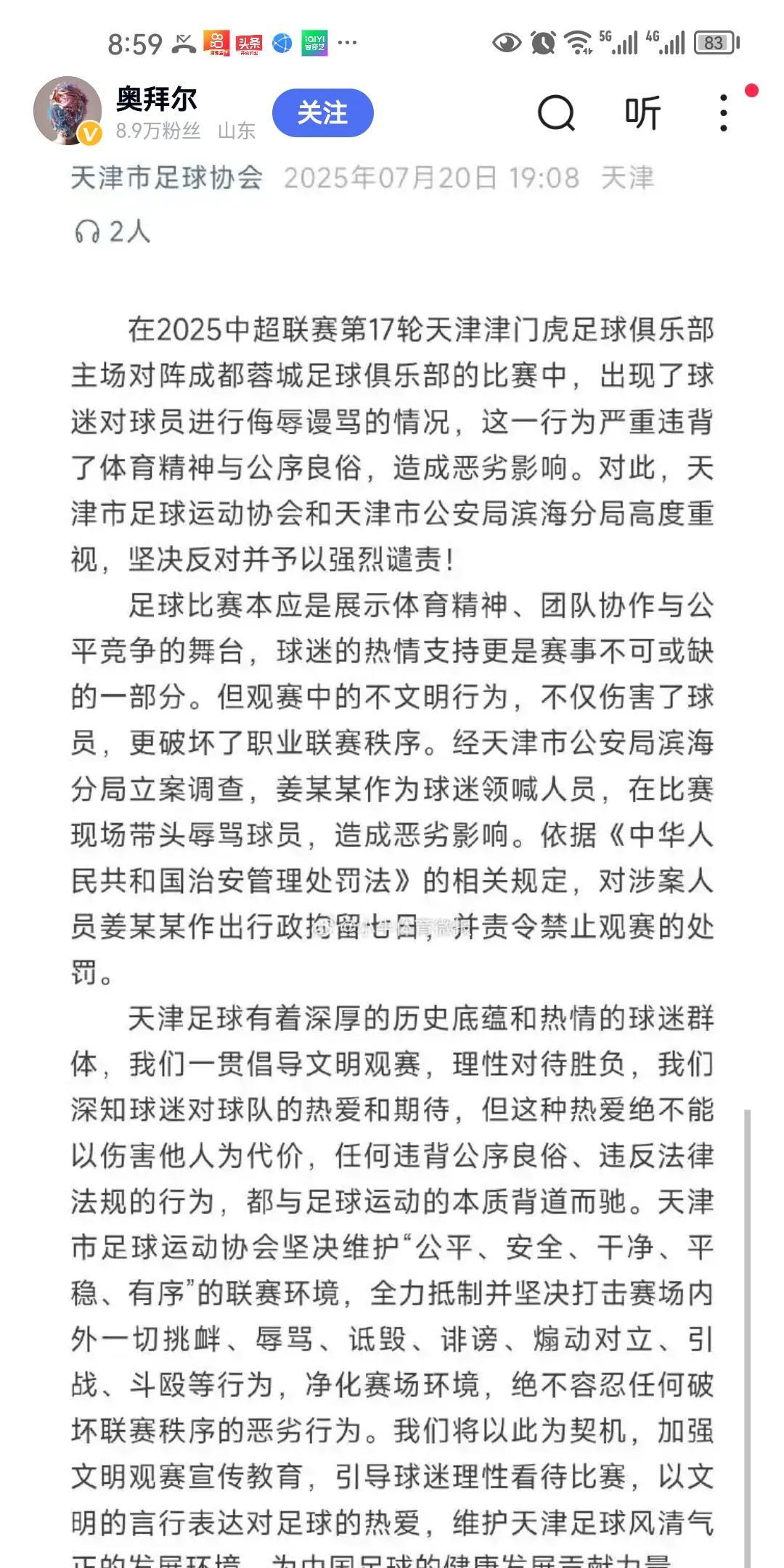 所有足球人士和球迷期待两天的结果来了。 今天终于让所有的赛区悬着的心落下来了。 此例不可开,此风不可长! 感谢天津市相关方面的处罚决定, 还了赛场看台一片朗朗晴天。 感谢为球迷清理了一个害群之马! 相信真正的球迷也会支持这个处罚。