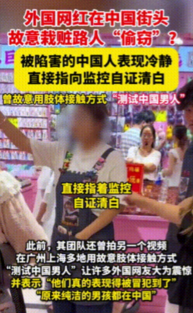 事情要从7月17日说起,这名女网红打着“测试中国治安”的旗号,在广州、上海等地刻意制造冲突:在广州两元店,她偷偷将顾客手机塞进店员围裙,再大声指控对方偷窃,在上海街头,她把手机藏进路人包里后诬陷对方是小偷,甚至在地铁里故意贴近男乘客、将手放在对方大腿上,对陌生女生强行靠肩,街头拉扯路人要求牵手……她将这些片段剪辑后发到海外平台,断章取义营造“中国治安差”的假象,几小时内播放量破百万。 但她没料到,被诬陷的店员当即指向监控要求调录像,被骚扰的路人也第一时间提出查看监控,证实了自己的清白,目前警方已介入调查,女网红国内平台封禁其账号,海外平台也在舆论压力下删除视频。