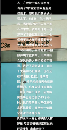 武汉,一男子为救落水的母子三人,跳下水将全部人救出,自己却被水流冲走,最终命大被人捞起,但由于失温和心搏骤停仍在ICU抢救,被救的母子却迟迟不曾露面。 2024年,7月14日,张先生(化名)带着自己休假的妹妹,来到了当地的一个水库进行游玩,他们早早的就来到在了这里,因为现在很多家长,都会带着孩子来这里郊游。 然而正当他们在准备一些零食时,突然听到了有人呐喊的求救声,紧接着张先生就看到了水库旁,已经站了许多人,张先生害怕出事,想着过去看看,万一自己能够帮上忙呢! 紧接着张先生便赶紧往水库旁边走去,这时候他突然看到了水中有着三人落水,而且其中两个竟然还是男孩,还有一个女人是这两个男孩的妈妈,旁边的人说,好像是两个男孩落水了,他们的妈妈下去救她们现在也在水中呼救! 张先生看着旁边站了好多人,但是大多数人都不会水性,张先生特别的担忧,他知道自己会水性,直接选择跳入了水库中,奋力的朝着他们母子三人游去! 但是他们三人都不会水性,张先生先从孩子救起,第一个孩子顺利的被他送到了岸边,岸上的其他乘客帮忙将孩子拉到了岸上,紧接着第二个孩子,随后又将两个孩子的母亲推到了岸边! 这时候因为救了他们三个人,张先生全身已经没有一丝一毫的力气了,在将两个孩子的母亲推到岸边后,他无力再抵抗水库中水流的冲击,被水流冲走,沉入了水中! 站在岸边的妹妹连忙大声的呼救,用自己最大的力气,喊道:“有没有人会游泳啊!求求你们了,救救我哥哥吧!”这时候离得较远的几人会水性,他们赶紧跑过来,跳入水中将沉入水里的张先生救了出来! 当时已经有人报了警,并且联系了急救人员,张先生也被紧急的送往医院进行救治,但是由于他落入水中后,造成了失温和心脏骤停,在ICU里进行抢救! 但是令人感到气愤的是,张先生因救她们母子三人躺在ICU里还未苏醒,她们母子三人竟然连一声谢谢都没说过,甚至别提去医院看望一下张先生了,哪怕他们不知道张先生在哪,隔空说声谢谢也行,现在的网络这么发达! 这件事让张先生的妹妹十分的气愤,将这件事发布在了网上,事件一经曝光,在网上迅速地,引起了众多网友的热议: 有的网友称道:“现在的好人,现在的见义勇为,哪还有人愿意去不顾自己的命救人,那个女人即使倾家荡产都应该回报人家救你们一家三人的命,怎么可以连一句简单的谢谢二字都不说!” 还有的网友说道:“救人者舍身成仁,被救者却冷漠如冰。连狗都不如的不是救人者,是那颗被良知遗忘的心!寒的是英雄血,凉的是众人情。” 那么,对于这件事,大家有什么看法? 信源:齐鲁晚报