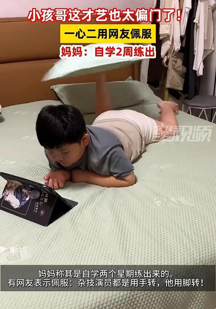 这个男孩真是太厉害了!7月20日,河南一名女子发视频称,自己的孩子自学用脚转枕头,学了两个星期,就已经非常熟练,同时还能中途换脚继续转,并且能够看着平板一心二用,不少网友对此表示佩服,觉得用手转已经很难了。