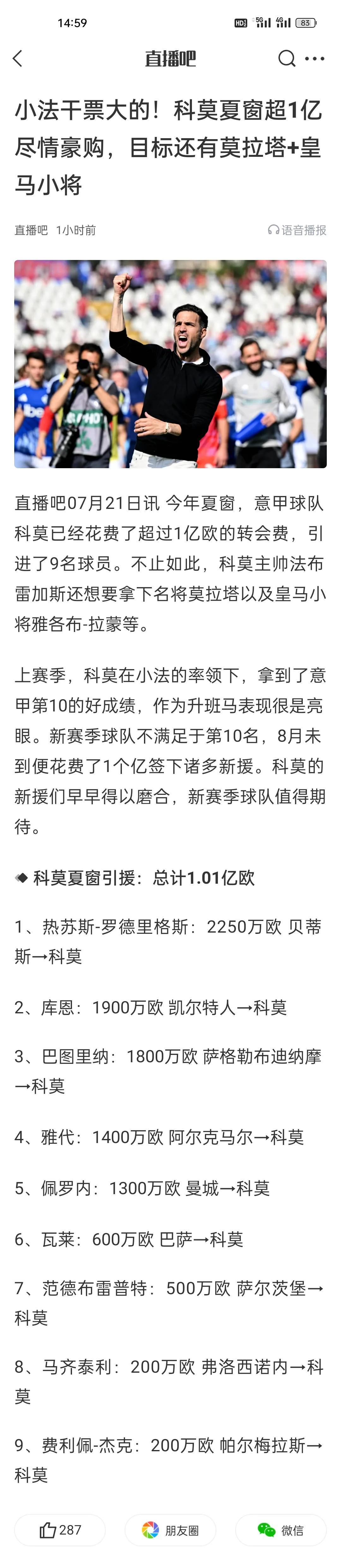 小法干票大的!科莫夏窗超1亿尽情豪购,目标还有莫拉塔+皇马小将。 能一口气签下几个1千多2千万的球员,在意甲中下游球队里面,真的是下了重本啊。上赛季很多输场比赛,都是1球小负,如果这是球队针对性补强的话,提升空间很大,说不定有竞争欧战资格的能力。 升班马第一年成绩好,可能是对手不熟悉。然后来年买了这么多新人,对手可能还会有点懵,但是新人磨合需要多久,也是个问题。 全方位地补强,今年要是出了成绩,明年再针对性买一些强点,科莫还真能竞争一下意甲冠军,关键是有钱舍得花啊。