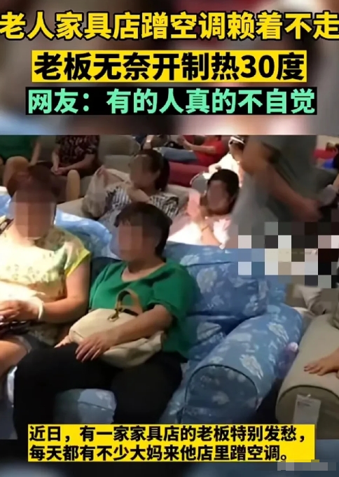 老人为了蹭空调“赖”家具店不走,老板开制热30度反击,最近天气炎热,有家家具店老板可愁坏了!不是发愁生意,而是因为店里天天来一帮大妈拖家带口的来蹭空调,一坐就是大半天,撵都撵不走,更有甚者直接脱鞋上床垫上面睡觉。
