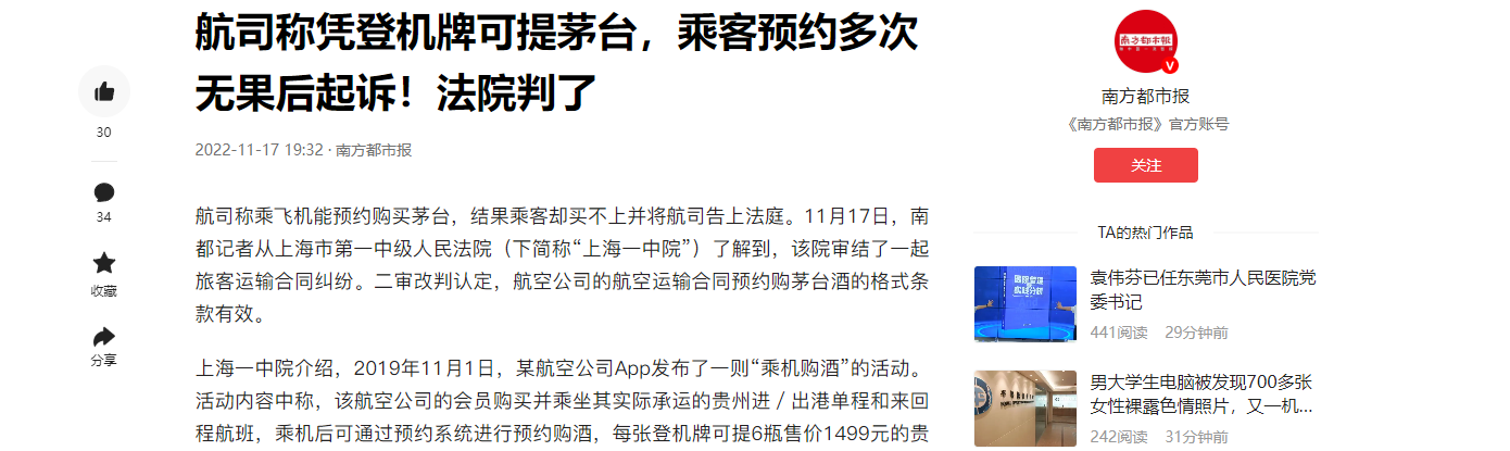 这一情况令他感到非常沮丧,于是,他决定采取法律手段,向航空公司提出诉求,希望法院判决航空公司按照活动规则,以1499元的价格向他出售共计78瓶茅台酒。