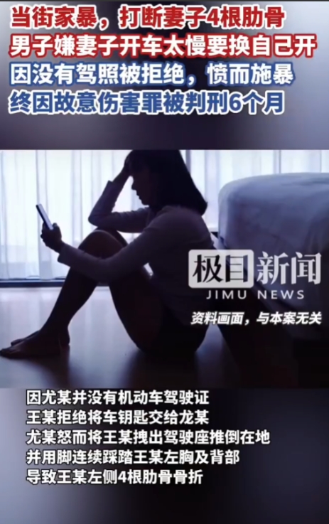 可是自尊心非常重的尤某根本听不了妻子的拒绝,在他看来妻子拒绝自己,就是在嘲笑自己没有驾照。自己虽然没有驾照,但是开的一定比妻子好。更主要的是,在他的潜意识当中,绝对不承认自己会比妻子还差! 尤某直接怒火攻心,掐着王女士的脖子让她停车,王女士担心出意外,所以就赶紧熄火停车。停好车之后,尤某直接冲到主驾驶的位置,拖着妻子的头发拽下了驾驶位,然后就对准妻子的背部、胸部、膝盖等处开始殴打。 王女士当即就开始求饶,可是并没有唤醒丈夫的良知,换来的是更变本加厉的殴打。尤某发泄完情绪之后,驾驶汽车扬长而去,留下昏迷不醒的王女士。最终还是好心路人赶紧报警,王女士这才被送往了医院,而尤某也因故意伤害被警方起诉。 王女士被鉴定为左胸断了4根,已经达成轻伤二级、右膝构成轻微伤。尤某试图和妻子和解,可妻子下定决心执意让丈夫受到应有的惩罚。最终法院认为,这是一桩典型的家庭暴力案件。尤某对妻子存在恐吓、精神侵害、殴打、残害等行为。所以判尤某有期徒刑6个月,并赔偿2.5万元的损失。 家庭本是避风的港湾,但是却有太多人“以爱之名”,行伤人之事。妻子本是好心劝解,也是对丈夫好,可是这种劝解,却像“忠言逆耳”,一点就炸。婚姻里面两方应该是平等的,互相尊重的。因为只有这样婚姻才会更长久,也可以给孩子做榜样。 不公平的婚姻,迟早会失衡,一味的纵容也不会换到同样的尊重。还是那句话,家暴只有0次和无数次,希望所有人都保护好自己。对此,你怎么看呢?