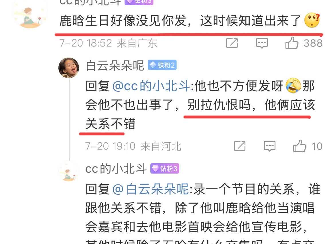 7月20日,鹿晗为老舅庆生,鹿晗粉丝找老舅秋后算账,我真是服了,这俩难兄难弟! 感觉现在粉丝成了艺人交友的重大阻碍,鹿晗本来帮老舅庆生,挺开心的一件事,也挺敞亮的,老舅也回复了,还夸鹿晗帅,本来挺哥俩好的兄弟情,愣是被一些粉丝打破,搞的很尴尬,秋后算账也不必急于一时吧! 等下次鹿晗生日的时候,再提醒老舅也行,何必在大家开心的时候说扫兴的话么? 整的人以后见面也挺尴尬的……