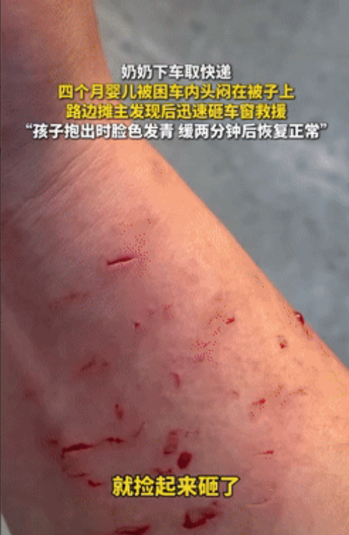 杨先生二话没说,捡起路边的砖头就往后车窗砸,玻璃碎了,孩子被抱出来的时候,小脸青紫青紫的,过了好几分钟才缓过劲来。