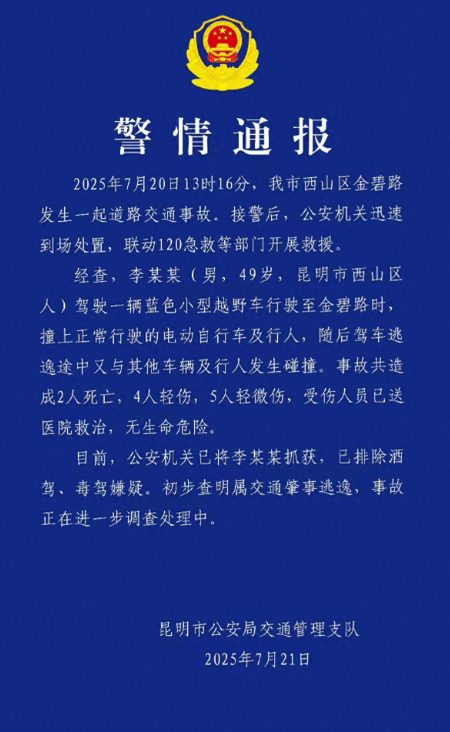 2025年7月20日13时16分,昆明市中心金碧路突发惨烈车祸:一辆蓝色越野车在闹市区疯狂冲撞行人及电动车,造成2人死亡、9人受伤。现场目击者拍摄的视频显示,马路上横七竖八躺着多辆电动车,至少3名伤者倒地不动,警车特警车迅速封锁现场,救护车紧急转运伤员。这起事件因肇事司机逃逸途中继续碰撞其他车辆,被警方定性为"交通肇事逃逸",而非外界猜测的恐怖袭击。